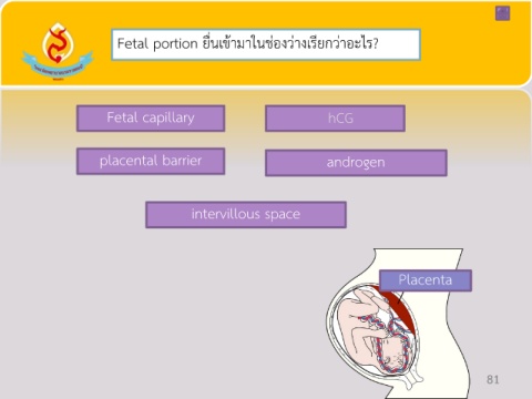 Fetal portion ยื่นเข้ามาในช่องว่างเรียกว่าอะไร? Fetal capillary hCG placental barrier androgen intervillous space Placenta 81 81