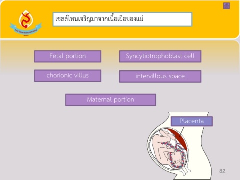 เซลล์ไหนเจริญมาจากเนื้อเยื่อของแม่ Fetal portion Syncytiotrophoblast cell chorionic villus intervillous space Maternal portion Placenta 82 82