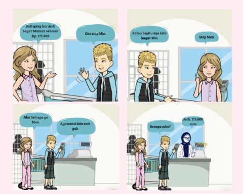 Jadi yang harus di bayar Maman sebesar Oke siap Min. Kalau begitu ayo kita Rp. 175.000 bayar Min Siap Man Aku beli apa ya Jadi, 175.000 Man. Ayo nanti kita cari mas yah Berapa mba? 175.000