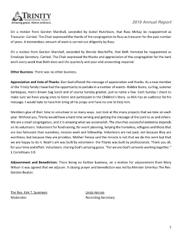Treasurer. Carried. The Chair expressed the thanks of the congregation to Russ as treasurer for the past number