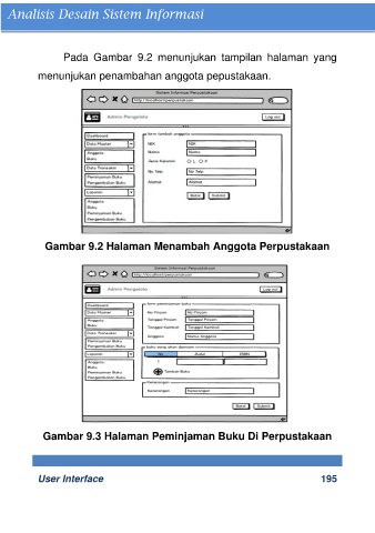 Pada Gambar 9.2 menunjukan tampilan halaman yang menunjukan penambahan anggota pepustakaan. Gambar 9.2 Halaman Menambah Anggota Perpustakaan Gambar 9.3 Halaman Peminjaman Buku Di Perpustakaan User Interface 195