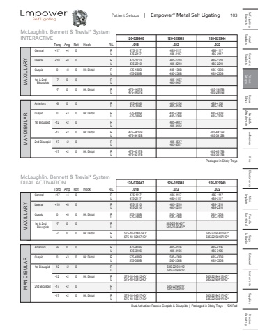 103 Self Ligating Metal Cosmetic Patient Buccal Bands & Adhesives Wire Elastomerics Mini Fixed & Stops Extraoral Instruments Supplies Practice Brackets Brackets Brackets Setups Tubes Attachments Implants Functional & Hooks MarketingPatient Setups | Empower%u00ae Metal Self LigatingPackaged in Sticky TraysDual Activation: Passive Cuspids & Bicuspids | Packaged in Sticky Trays | *BX PadINTERACTIVE 126-029940 126-029943 126-029944 Torq Ang Rot Hook R/L .018 .022 .022Central +17 +4 0 R 475-1117 485-1117 485-1117 L 475-2117 485-2117 485-2117Lateral +10 +8 0 R 475-1210 485-1210 485-1210 L 475-2210 485-2210 485-2210Cuspid 0 +8 0 Hk Distal R 475-130B 485-130B 485-130B L 475-230B 485-230B 485-230B1st & 2nd -7 0 0 R 485-1407 Bicuspids L 485-2407 -7 0 0 Hk Distal R 475-1407B 485-1407B L 475-2407B 485-2407BAnteriors -6 0 0 R 475-4106 485-4106 485-4106 L 475-3106 485-3106 485-3106Cuspid 0 +3 0 Hk Distal R 475-430B 485-430B 485-430B L 475-330B 485-330B 485-330B1st Bicuspid -12 +2 0 R 485-4412 L 485-3412 -12 +2 0 Hk Distal R 475-4412B 485-4412B L 475-3412B 485-3412B2nd Bicuspid -17 +2 0 R 485-4517 L 485-3517 -17 +2 0 Hk Distal R 475-4517B 485-4517B L 475-3517B 485-3517BDUAL ACTIVATION 126-029947 126-029948 126-029949 Torq Ang Rot Hook R/L .018 .022 .022Central +17 +4 0 R 475-1117 485-1117 485-1117 L 475-2117 485-2117 485-2117Lateral +10 +8 0 R 475-1210 485-1210 485-1210 L 475-2210 485-2210 485-2210Cuspid 0 +8 0 Hk Distal R 575-130B 585-130B 585-130B L 575-230B 585-230B 585-230B1st & 2nd -7 0 0 R 585-22-91407* Bicuspids L 585-22-92407* -7 0 0 Hk Distal R 575-18-91407HD* 585-22-91407HD* L 575-18-92407HD* 585-22-92407HD*Anteriors -6 0 0 R 475-4106 485-4106 485-4106 L 475-3106 485-3106 485-3106Cuspid 0 +3 0 Hk Distal R 575-430B 585-430B 485-430B L 575-330B 585-330B 485-330B1st Bicuspid -12 +2 0 R 585-22-94412 L 585-22-93412 -12 +2 0 Hk Distal R 575-18-94412HD* 585-22-94412HD* L 575-18-93412HD* 585-22-93412HD*2nd Bicuspid -17 +2 0 R 585-22-94517 L 585-22-93517 -17 +2 0 Hk Distal R 575-18-94517HD* 585-22-94517HD* L 575-18-93517HD* 585-22-93517HD*McLaughlin, Bennett & Trevisi* SystemMcLaughlin, Bennett & Trevisi* System MAXILLARY MAXILLARY MANDIBULAR MANDIBULAR
