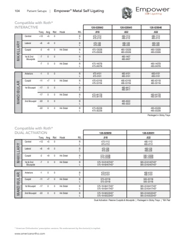 104 Patient Setups | Empower%u00ae Metal Self Ligating* American Orthodontics%u2019 prescription versions. No endorsement by the doctor(s) is implied.Packaged in Sticky TraysDual Activation: Passive Cuspids & Bicuspids | Packaged in Sticky Trays | *BX PadINTERACTIVE 126-029942 126-029945 126-029946 Torq Ang Rot Hook R/L .018 .022 .022Central +12 +5 0 R 475-1112 485-1112 485-1112 L 475-2112 485-2112 485-2112Lateral +8 +9 0 R 475-128 485-128 485-128 L 475-228 485-228 485-228Cuspid -2 +9 0 Hk Distal R 475-1302B 485-1302B 485-1302B L 475-2302B 485-2302B 485-2302B1st & 2nd -7 0 0 R 485-1407 Bicuspids L 485-2407 -7 0 0 Hk Distal R 475-1407B 485-1407B L 475-2407B 485-2407BAnteriors -1 0 0 R 475-4101 485-4101 485-4101 L 475-3101 485-3101 485-3101Cuspid -11 +7 0 Hk Distal R 475-4311B 485-4311B 485-4311B L 475-3311B 485-3311B 485-3311B1st Bicuspid -17 0 0 R 485-4417 L 485-3417 -17 0 0 Hk Distal R 475-4417B 485-4417B L 475-3417B 485-3417B2nd Bicuspid -22 0 0 R 485-4522 L 485-3522 -22 0 0 Hk Distal R 475-4522B 485-4522B L 475-3522B 485-3522BDUAL ACTIVATION 126-029950 126-029951 Torq Ang Rot Hook R/L .018 .022Central +12 +5 0 R 475-1112 485-1112 L 475-2112 485-2112Lateral +8 +9 0 R 475-128 485-128 L 475-228 485-228Cuspid -2 +9 0 Hk Distal R 575-1302B 585-1302B L 575-2302B 585-2302B1st & 2nd -7 0 0 Hk Distal R 575-18-91407HD* 585-22-91407HD* Bicuspids L 575-18-92407HD* 585-22-92407HD*Anteriors -1 0 0 R 475-4101 485-4101 L 475-3101 485-3101Cuspid -11 +7 0 Hk Distal R 575-4311B 585-4311B L 575-3311B 585-3311B1st Bicuspid -17 0 0 Hk Distal R 575-18-94417HD* 585-22-94417HD* L 575-18-93417HD* 585-22-93417HD*2nd Bicuspid -22 0 0 Hk Distal R 575-18-94522HD* 585-22-94522HD* L 575-18-93522HD* 585-22-93522HD*Compatible with Roth*Compatible with Roth* MANDIBULAR MANDIBULAR MAXILLARY MAXILLARYwww.americanortho.com