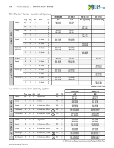106 Patient Setups | Mini Master%u00ae SeriesPackaged in Sticky Trays 126-030200 126-030199 126-031444 126-031445 Torq Ang Rot Hook R/L .018 .022 .022 Upper Only .022 Lower OnlyCentral +17 +4 0 R 390-1014 390-1016 L 390-1015 390-1017 +12 +5 0 R 390-1201 L 390-1202Lateral +10 +8 0 R 390-1503 390-1603 L 390-1504 390-1604 +8 +9 0 R 390-1203 L 390-1204Cuspid -7 +7 0 Hk Distal R 390-1705B 390-1805B L 390-1706B 390-1806B 0 +8 0 Hk Distal R 390-5247B L 390-5248B1st & 2nd -7 0 0 Hk Mesial R 390-0104B 390-0114BBicuspids L 390-0105B 390-0115B -7 0 2 Hk Mesial R 390-1407B L 390-1408BAnteriors -6 0 0 R/L 390-1510 390-1610 390-1610Cuspid -6 +3 0 Hk Distal R 390-1519B 390-1619B L 390-1520B 390-1620B 0 +3 0 Hk Distal R 390-1621B L 390-1622B1st Bicuspid -12 +2 0 Hk Distal R 390-1512B 390-1612B L 390-1513B 390-1613B -17 0 4 Hk Distal R 390-1418B L 390-1419B2nd Bicuspid -17 +2 0 Hk Distal R 390-1514B 390-1614B L 390-1515B 390-1615B -17 0 4 Hk Distal R 390-1418B L 390-1419B MANDIBULAR MAXILLARYMini Master%u00ae Series - Additional OptionsAll MMS Hooks are Distal unless otherwise noted | Packaged in Sticky Trays 126-031356 126-031357 Torq Ang Rot Hook M-D R/L .018 .022Central +15 +5 0 Diagonal Twin .140 R 390-1214 390-1216 L 390-1215 390-1217Lateral +9 +9 0 Hk Distal .100 R 390-1063B 390-1073B L 390-1064B 390-1074BCuspid -3 +10 0 Hk Distal, Lang, 6.5 mm .050 R 390-3000B 390-3200B L 390-3001B 390-3201B1st Bicuspid -6 0 0 Hk Distal, Lang, 5.5 mm .050 R 390-3607MBUR 390-3627MBUR L 390-3607MBUL 390-3627MBUL2nd Bicuspid -8 +3 0 Hk Distal, Lang, 5.5 mm .050 R 390-3307MB 390-3327MB L 390-3308MB 390-3328MBCentral -5 +2 0 Lang, 4.5 mm .050 R 390-3309M 390-3329M L 390-3310M 390-3330MLateral -5 +6 0 Hk Distal, Lang, 4.5 mm .050 R 390-3311MB 390-3339MB L 390-3312MB 390-3340MBCuspid -7 +6 0 Hk Distal, Lang, 4.5 mm .050 R 390-3004B 390-3204B L 390-3005B 390-3205B1st Bicuspid -7 0 0 Hk Distal, Lang, 5.5 mm .050 R 390-3360MBLR 390-3361MBLR L 390-3360MBLL 390-3361MBLL2nd Bicuspid -9 0 0 Hk Distal, Lang, 5.5 mm .050 R 390-3380MBLR 390-3381MBLR L 390-3380MBLL 390-3381MBLLAlexander* Long Term Stability System MANDIBULAR MAXILLARYwww.americanortho.com