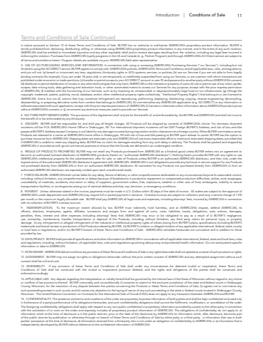 Introduction | Conditions of Sale 11Terms and Conditions of Sale Continuedin nature pursuant to Section 12 of these Terms and Conditions of Sale. BUYER has no authority to sublicense AMERICAN%u2019s proprietary product information. BUYER is strictly prohibited from disclosing, distributing, selling, or otherwise using AMERICAN%u2019s proprietary product information in any manner, and in the event of any such violation, AMERICAN shall be entitled to immediate injunctive and any other equitable relief and to receive damages resulting from the violation, including any legal fees incurred in enforcing the violation. Purchases from AMERICAN loyalty programs in the US and Canada (e. g., Partner Program) and through AMERICAN%u2019s AO Direct service are subject to all terms and conditions herein. Program details are available via your AMERICAN field sales representative.3. USE OF AO PURCHASING SERVICES AND INFORMATION. In connection with using or accessing AMERICAN%u2019s Purchasing Services (%u201cour Services%u201d), including but not limited to using the AO DIRECT service, BUYER agrees to comply with AMERICAN%u2019s policies, AMERICAN%u2019s Terms and Conditions, and all applicable laws, rules, and regulations, and you will not: (a) breach or circumvent any laws, regulations, third-party rights or AO%u2019s systems, services, or policies; (b) use our Services if you are not able to form legally binding contracts (for example, if you are under 18 years old), or are temporarily or indefinitely suspended from using our Services, or are a person with whom transactions are prohibited under economic or trade sanctions; (c) transfer or permit access to your AO DIRECT account or user ID and password to another party without AMERICAN%u2019s consent; (d) distribute or permit distribution of viruses or any other technologies that may harm AMERICAN or the interests or property of users; (e) use or permit use of any robot, spider, scraper, data mining tools, data gathering and extraction tools, or other automated means to access our Services for any purpose, except with the prior express permission of AMERICAN; (f) interfere with the functioning of our Services, such as by imposing an unreasonable or disproportionately large load on our infrastructure; (g) infringe the copyright, trademark, patent, publicity, moral, database, and/or other intellectual property rights (collectively, \AMERICAN. Some, but not all, actions that may constitute infringement are reproducing, performing, displaying, distributing, copying, reverse engineering, decompiling, disassembling, or preparing derivative works from content that belongs to AMERICAN; (h) commercialize any AMERICAN application (e.g. AO DIRECT) or any information or software associated with such application, except with the prior express permission of AMERICAN; (i) harvest or otherwise collect information about AMERICAN product prices without AMERICAN%u2019s consent; or (j) circumvent any technical measures used to provide our Services. 4. NO THIRD PARTY BENEFICIARIES. The provisions of this Agreement shall only be for the benefit of, and enforceable by, the BUYER and AMERICAN and shall not inure to the benefit of or be enforceable by any third party.5. DELIVERY. BUYER shall be responsible for and shall pay all freight charges. All Products will be shipped by carrier(s) of AMERICAN%u2019s choice. For domestic shipment incoterms will be FCA AMERICAN%u2019s Home Office in Sheboygan, WI. For international shipment incoterms will be DAP Foreign BUYER%u2019S Address, and risk of loss and title passes at BUYER%u2019S Address except Company is not liable for any damage incurred during importation and/or clearance into a foreign country. When BUYER nominates a carrier, Products are released to a carrier at AMERICAN%u2019s home office in Sheboygan, WI with risk of loss and title passing to BUYER upon release to carrier. BUYER has the option to purchase insurance from AMERICAN. Shipping dates are estimates only and AMERICAN will use every reasonable effort to meet such estimated shipping dates; provided that if AMERICAN is unable to meet any shipping date, BUYER has no claim for damages resulting from any such delay in delivery. The Products shall be packed and shipped by AMERICAN in accordance with good commercial practices to ensure that the Goods are delivered in an undamaged condition. 6. RESALE OF PRODUCTS PROHIBITED. BUYER may not resell any Products purchased from AMERICAN as a finished good unless BUYER enters into an agreement to become an authorized licensed distributor of AMERICAN%u2019s products (herein an %u201cauthorized AMERICAN distributor%u201d). Nothing herein provides BUYER with any rights to use AMERICAN%u2019s intellectual property for the advertisement, offer for sale, or sale of Products unless BUYER is an authorized AMERICAN distributor, and then only under the express terms of the authorized AMERICAN distributor%u2019s agreement with AMERICAN. AMERICAN is not obligated to provide any technical or service support for any Products not purchased directly from AMERICAN or from an authorized AMERICAN distributor. All warranties for any Products not purchased directly from AMERICAN or from an authorized AMERICAN distributor are expressly voided upon each unauthorized resale.7. FORCE MAJEURE. AMERICAN shall not be liable for any delay, failure of delivery or other nonperformance attributable to any circumstances beyond its reasonable control, including, without limitation, any nonperformance or delays because of breakdowns in production equipment or unexpected production difficulties, strikes, work stoppages, unavailability of materials, accidents, shut-down or delay of suppliers, government orders, fires, explosions, weather or other acts of God, embargoes, inability to secure transportation facilities, or contingencies arising out of national defense activities, war, terrorism, or emergency conditions. 8. PAYMENT. Unless otherwise stated in the invoi