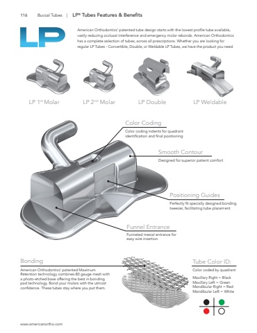 www.americanortho.com116 Buccal Tubes | LP%u00ae Tubes Features & BenefitsPositioning GuidesPerfectly fit specially designed bonding tweezer, facilitating tube placementColor CodingColor coding indents for quadrant identification and final positioningFunnel EntranceFunneled mesial entrance foreasy wire insertionSmooth ContourDesigned for superior patient comfortAmerican Orthodontics%u2019 patented tube design starts with the lowest profile tube available, vastly reducing occlusal interference and emergency molar rebonds. American Orthodontics has a complete selection of tubes, across all prescriptions. Whether you are looking for regular LP Tubes - Convertible, Double, or Weldable LP Tubes, we have the product you need.Tube Color ID: Color coded by quadrantMaxillary Right = BlackMaxillary Left = GreenMandibular Right = RedMandibular Left = WhiteBondingAmerican Orthodontics%u2019 patented Maximum Retention technology combines 80 gauge mesh with a photo-etched base offering the best in bonding pad technology. Bond your molars with the utmost confidence. These tubes stay where you put them.LP 1st Molar LP 2nd Molar LP Double LP Weldable