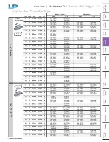 117 Self Ligating Metal Cosmetic Patient Buccal Bands & Adhesives Wire Elastomerics Mini Fixed & Stops Extraoral Instruments Supplies Practice Brackets Brackets Brackets Setups Tubes Attachments Implants Functional & Hooks MarketingBuccal Tubes | LP%u00ae 1st Molar Non Convertible Single957 / 958MAXILLARY MANDIBULAR955 / 956* Alternate Pad Available1st Molar - Non Convertible Single DIRECT BOND WELDABLE Torq Rot M-D Pad R/L .018 .022 .018 .0221st Molar 0 0 4.5 mm 957/958 R 957-703CR 957-723CRNon Convertible L 958-703CL 958-723CL 0 5 4.5 mm 957/958 R 957-1031C 957-1041C 004-1031C 004-1041C L 958-1030C 958-1040C 004-1030C 004-1040C -10 0 4.5 mm 957/958 R 957-704CR 957-724CR* 003-704CR 003-724CR L 958-704CL 958-724CL* 003-704CL 003-724CL -10 5 4.5 mm 957/958 R 957-1032C 957-1042C 004-1032C 004-1042C L 958-1033C 958-1043C 004-1033C 004-1043C -10 5 3.2 mm 957/958 R 957-3004C L 958-3005C -10 10 4.5 mm 957/958 R 957-1005C 957-1025C 004-1005C 004-1025C L 958-1006C 958-1026C 004-1006C 004-1026C -10 10 3.2 mm 957/958 R 957-2005C 957-2025C L 958-2006C 958-2026C -14 0 4.5 mm 957/958 R 957-705CR 957-725CR 003-705CR 003-725CR L 958-705CL 958-725CL 003-705CL 003-725CL -14 0 3.2 mm 957/958 R 957-810C L 958-811C -14 5 4.5 mm 957/958 R 957-1034C 957-1044C 004-1034C 004-1044C L 958-1035C 958-1045C 004-1035C 004-1045C -14 10 4.5 mm 957/958 R 957-1007C 957-1027C* 004-1007C 004-1027C L 958-1008C 958-1028C* 004-1008C 004-1028C -14 10 3.2 mm 957/958 R 957-2007C 957-2027C L 958-2008C 958-2028C -18 10 4.5 mm 957/958 R 957-1050C 957-1070C 004-1070C L 958-1051C 958-1071C 004-1071C -20 5 4.5 mm 957/958 R 957-1047C 004-1047C L 958-1046C 004-1046C -20 5 3.2 mm 957/958 R 957-3016C L 958-3017C -25 5 4.5 mm 957/958 R 957-1049C L 958-1048C -25 5 3.2 mm 957/958 R 957-3015C L 958-3014C 0 0 4.5 mm 955/956 R 955-703CR 955-723CR 003-703CR 003-723CR L 956-703CL 956-723CL 003-703CL 003-723CL 0 5 4.5 mm 955/956 R 955-1030C 955-1040C 004-1030C 004-1040C L 956-1031C 956-1041C 004-1031C 004-1041C -10 0 4.5 mm 955/956 R 955-704CR 955-724CR 003-704CL 003-724CL L 956-704CL 956-724CL 003-704CR 003-724CR -10 0 3.2 mm 955/956 R 955-805C 955-807C L 956-804C 956-806C -10 5 4.5 mm 955/956 R 955-1033C 955-1043C 004-1033C 004-1043C L 956-1032C 956-1042C 004-1032C 004-1042C -10 5 3.2 mm 955/956 R 955-3007C L 956-3006C -14 0 4.5 mm 955/956 R 955-705CR 955-725CR* 003-705CL 003-725CL L 956-705CL 956-725CL* 003-705CR 003-725CR -14 5 4.5 mm 955/956 R 955-1035C 955-1045C 004-1035C 004-1045C L 956-1034C 956-1044C 004-1034C 004-1044C -20 0 4.5 mm 955/956 R 955-706CR 955-726CR* 003-706CR 003-726CR L 956-706CL 956-726CL* 003-706CL 003-726CL -20 5 4.5 mm 955/956 R 955-1036C 955-1046C 004-1036C 004-1046C L 956-1037C 956-1047C 004-1037C 004-1047C -25 0 4.5 mm 955/956 R 955-707CR 955-727CR 003-707CR 003-727CR L 956-707CL 956-727CL 003-707CL 003-727CL -25 0 3.2 mm 955/956 R 955-812C 955-814C L 956-813C 956-815C -25 5 4.5 mm 955/956 R 955-1038C 955-1048C 004-1038C 004-1048C L 956-1039C 956-1049C 004-1039C 004-1049C -28 0 4.5 mm 955/956 R 955-708CR 955-728CR 003-728CR L 956-708CL 956-728CL 003-728CL