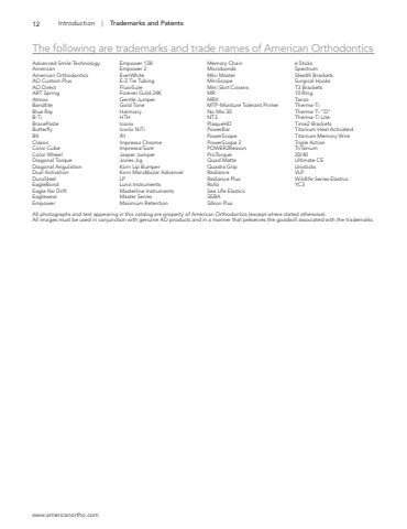 www.americanortho.com12All photographs and text appearing in this catalog are property of American Orthodontics (except where stated otherwise). All images must be used in conjunction with genuine AO products and in a manner that preserves the goodwill associated with the trademarks.Advanced Smile TechnologyAmericanAmerican OrthodonticsAO Custom PlusAO DirectART SpringAtmosBandtiteBlue RayB-TiBracePasteButterflyBXClassicColor CubeColor WheelDiagonal TorqueDiagonal AngulationDual ActivationDuraSteelEagleBondEagle No DriftEaglewearEmpowerEmpower 128Empower 2EverWhiteE-Z Tie TubingFluorSureForever Gold 24KGentle JumperGold ToneHarmonyHTHIconixIconix NiTiifitImpressa ChromeImpressa/SureJasper JumperJones JigKorn Lip BumperKorn Mandibular AdvancerLPLuno InstrumentsMasterline InstrumentsMaster SeriesMaximum RetentionMemory ChainMicrobondsMini MasterMiniScopeMini Skirt CrownsMR MRXMTP-Moisture Tolerant PrimerNo Mix:30NT3PlaqueHDPowerBarPowerScopePowerScope 2POWER2ReasonProTorqueQuad MatteQuadra GripRadianceRadiance PlusRolloSea Life ElasticsSEBASilkon Plus6 SticksSpectrumStealth BracketsSurgical HooksT3 Brackets10 RingTanzoTherma-TiTherma-Ti %u201cD%u201dTherma-Ti LiteTime2 BracketsTitanium Heat ActivatedTitanium Memory WireTriple ActionTriTanium20/40Ultimate CEUnisticksVLPWildlife Series ElasticsYC3Introduction | Trademarks and PatentsThe following are trademarks and trade names of American Orthodontics