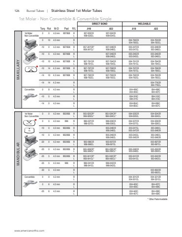 www.americanortho.com126 Buccal Tubes | Stainless Steel 1st Molar Tubes MAXILLARY MANDIBULAR1st Molar - Non Convertible & Convertible Single DIRECT BOND WELDABLE Torq Rot M-D Pad R/L .018 .022 .018 .0221st Molar 0 0 4.2 mm 957/958 R 957-025CR 957-024CR Non Convertible L 958-025CL 958-024CL 0 10 4.2 mm R 004-760CR 004-763CR L 004-760CL 004-763CL -10 0 4.2 mm 957/958 R 957-247CR* 957-248CR 003-247CR 003-248CR L 958-247CL* 958-248CL 003-247CL 003-248CL -10 5 4.2 mm 957/958 R 957-246CR 003-245CR 003-246CR L 958-246CL 003-245CL 003-246CL -10 10 4.2 mm 957/958 R 957-761CR 957-764CR 004-761CR 004-764CR L 958-761CL 958-764CL 004-761CL 004-764CL -10 14 4.2 mm 957/958 R 957-767CR 957-769CR 004-767CR 004-769CR L 958-767CL 958-769CL 004-767CL 004-769CL -14 10 4.2 mm 957/958 R 957-762CR 957-765CR 004-762CR 004-765CR L 958-762CL 958-765CL 004-762CL 004-765CL -14 14 4.2 mm R 004-776CR L 004-776CLConvertible 0 8 4.2 mm R 004-406C 004-408C L 004-405C 004-407C -10 0 4.2 mm R 004-310C 004-312C L 004-311C 004-313C -14 0 4.2 mm R 004-854C 004-856C L 004-855C 004-857C1st Molar 0 0 4.2 mm 955/956 R 955-025CR* 955-024CR* 004-025CR 004-024CRNon Convertible L 956-025CL* 956-024CL* 004-025CL 004-024CL 0 5 4.2 mm 996 R 996-027CR 996-026CR 004-027CR 004-026CR L 996-027CL 996-026CL 004-027CL 004-026CL -10 0 4.2 mm 955/956 R 955-248CR 003-247CL 003-248CL L 956-248CL 003-247CR 003-248CR -10 5 4.2 mm 955/956 R 955-246CR 003-245CL 003-246CL L 956-246CL 003-245CR 003-246CR -20 0 4.2 mm 955/956 R 955-066CR 955-067CR 003-067CR L 956-066CL 956-067CL 003-067CL -25 0 4.2 mm 955/956 R 955-249CR* 955-250CR* 003-249CR 003-250CR L 956-249CL* 956-250CL* 003-249CL 003-250CL -25 5 4.2 mm 955/956 R 955-041CR* 955-042CR* 003-041CR 003-042CR L 956-041CL* 956-042CL* 003-041CL 003-042CL -25 5 4.2 mm 996 R 996-041CR 996-042CR L 996-041CL 996-042CL -30 5 4.2 mm R 003-062CR L 003-062CLConvertible 0 0 4.2 mm R 004-301CR 004-321CR L 004-301CL 004-321CL 0 6 4.2 mm R 004-405C 004-407C L 004-406C 004-408C -25 6 4.2 mm R 004-440C 004-458C L 004-457C 004-459C957 / 958955 / 956996* Other Pads Available