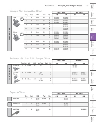 133 Self Ligating Metal Cosmetic Patient Buccal Bands & Adhesives Wire Elastomerics Mini Fixed & Stops Extraoral Instruments Supplies Practice Brackets Brackets Brackets Setups Tubes Attachments Implants Functional & Hooks MarketingBuccal Tubes | Bicuspid, Lip Bumper TubesBicuspid Non Convertible OffsetExpando Tubes DIRECT BOND WELDABLE Torq Rot M-D Pad R/L .018 .022 .018 .022L hook 0 0 2 mm 091 R 091-1400C 091-1402C L 091-1401C 091-1403C -7 0 2 mm 091 R 091-1404C 091-1406C L 091-1405C 091-1407C -10 0 2 mm 091 R 091-1410C L 091-1411C -17 0 2 mm 091 R 091-1414C L 091-1415CBall hook 0 0 2 mm 091 R 091-1500C 091-1502C L 091-1501C 091-1503C 0 0 2 mm 091 R 091-1516C 091-1518C L 091-1517C 091-1519C (no hook) (no hook) -7 0 2 mm 091 R 091-1504C 091-1506C L 091-1505C 091-1507C -10 0 2 mm 091 R 091-1510C L 091-1511C -17 0 2 mm 091 R 091-1512C 091-1514C L 091-1513C 091-1515C DIRECT BOND WELDABLE Torq Rot M-D Pad R/L .018 .022 .018 .022MAXILLARY 0 0 10 mm 957/958 R 957-110 Mesial L 958-110MANDIBULAR 0 0 10 mm 955/956 R 955-110 Mesial L 956-110UNIVERSAL 0 0 10 mm R/L 004-035692 Mesial1st Molar - Dr. Korn & Lip Bumper Triple DIRECT BOND WELDABLE Torq Rot M-D HG ID Aux Tube Pad R/L .018 .022 .018 .022Dr. Korn Tube 0 0 4.2 mm .045 .045 R 004-861C L 004-862CLip Bumper -25 6 4.2 mm .045 .018 R 004-560LB 004-562LBTriple -25 Torq L 004-561LB 004-563LB -25 6 4.2 mm .045 .018 R 004-564LB 004-566LB MANDIBULAR -25 Torq L 004-565LB 004-567LBMANDIBULAR