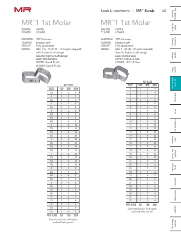 137 Self Ligating Metal Cosmetic Patient Buccal Bands & Adhesives Wire Elastomerics Mini Fixed & Stops Extraoral Instruments Supplies Practice Brackets Brackets Brackets Setups Tubes Attachments Implants Functional & Hooks Marketing KIT SIZESIZE 100 300 6001 1 2 42 1 2 43 1 2 44 1 2 65 1 3 66 1 3 67 1 4 88 1 4 89 2 4 810 2 6 1011 2 6 1012 2 8 2013 3 8 2014 3 8 2015 3 8 2016 3 8 2017 3 8 2018 2 8 1019 2 6 1020 2 6 1021 2 6 822 1 6 823 1 4 824 1 4 825 1 4 826 1 4 627 1 3 628 1 3 629 1 3 630 1 3 431 1 2 432 1 2 4PER SIDE 50 150 300Size distribution: half rightsand half lefts per kitMR%u21221 1st Molar500-000 UPPER510-000 LOWERMATERIAL .007 thicknessTEMPER Medium stiffHEIGHT Fully graduatedSIZING U&L 1 %u00bd - 13 (13 %u00bd - 14 %u00bd upon request)with %u00bc sizes in midrangeSpecific Right or Left designLaser etched sizesUPPER: Size & RU/LULOWER: Size & RL/LLMR%u21221 1st Molar505-000 UPPER515-000 LOWERMATERIAL .007 thicknessTEMPER Medium stiffHEIGHT Fully graduatedSIZING U&L 1 - 32 (33 - 37 upon request)Specific Right or Left designLaser etched sizesUPPER: UR/UL & SizeLOWER: LR/LL & Size KIT SIZESIZE 100 300 6001%u00bd 1 2 42 1 2 42%u00bd 1 2 43 1 2 63%u00bd 1 3 64 1 3 64%u00bc 1 4 84%u00bd 1 4 84%u00be 2 4 85 2 6 105%u00bc 2 6 105%u00bd 2 8 205%u00be 3 8 206 3 8 206%u00bc 3 8 206%u00bd 3 8 206%u00be 2 8 107 2 6 107%u00bc 2 6 107%u00bd 2 6 107%u00be 1 6 108 1 4 88%u00bc 1 4 88%u00bd 1 4 88%u00be 1 4 89 1 4 69%u00bd 1 3 610 1 3 610%u00bd 1 3 611 1 3 411%u00bd 1 2 412 1 2 412%u00bd 1 2 413 1 2 4PER SIDE 50 150 300Size distribution: half rightsand half lefts per kitBands & Attachments | MR%u2122 Bands