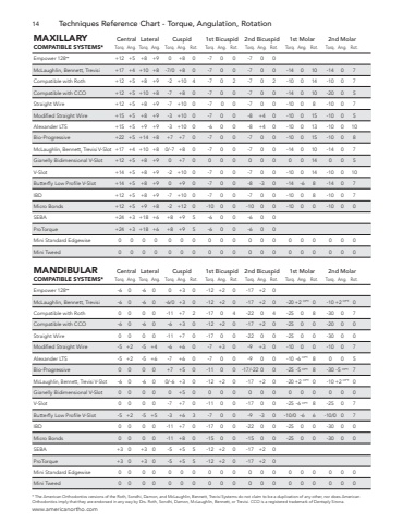 www.americanortho.com14* The American Orthodontics versions of the Roth, Sondhi, Damon, and McLaughlin, Bennett, Trevisi Systems do not claim to be a duplication of any other, nor does American Orthodontics imply that they are endorsed in any way by Drs. Roth, Sondhi, Damon, McLaughlin, Bennett, or Trevisi. CCO is a registered trademark of Dentsply Sirona.Techniques Reference Chart - Torque, Angulation, RotationMAXILLARY Central Lateral Cuspid 1st Bicuspid 2nd Bicuspid 1st Molar 2nd MolarCOMPATIBLE SYSTEMS* Torq. Ang. Torq. Ang. Torq. Ang. Rot. Torq. Ang. Rot. Torq. Ang. Rot. Torq. Ang. Rot. Torq. Ang. Rot.Empower 128%u2122 +12 +5 +8 +9 0 +8 0 -7 0 0 -7 0 0McLaughlin, Bennett, Trevisi +17 +4 +10 +8 -7/0 +8 0 -7 0 0 -7 0 0 -14 0 10 -14 0 7Compatible with Roth +12 +5 +8 +9 -2 +10 4 -7 0 2 -7 0 2 -10 0 14 -10 0 7Compatible with CCO +12 +5 +10 +8 -7 +8 0 -7 0 0 -7 0 0 -14 0 10 -20 0 5Straight Wire +12 +5 +8 +9 -7 +10 0 -7 0 0 -7 0 0 -10 0 8 -10 0 7Modified Straight Wire +15 +5 +8 +9 -3 +10 0 -7 0 0 -8 +4 0 -10 0 15 -10 0 5Alexander LTS +15 +5 +9 +9 -3 +10 0 -6 0 0 -8 +4 0 -10 0 13 -10 0 10Bio-Progressive +22 +5 +14 +8 +7 +7 0 -7 0 0 -7 0 0 -10 0 15 -10 0 8McLaughlin, Bennett, Trevisi V-Slot +17 +4 +10 +8 0/-7 +8 0 -7 0 0 -7 0 0 -14 0 10 -14 0 7Gianelly Bidimensional V-Slot +12 +5 +8 +9 0 +7 0 0 0 0 0 0 0 0 0 14 0 0 5V-Slot +14 +5 +8 +9 -2 +10 0 -7 0 0 -7 0 0 -10 0 14 -10 0 10Butterfly Low Profile V-Slot +14 +5 +8 +9 0 +9 0 -7 0 0 -8 -3 0 -14 -6 8 -14 0 7IBD +12 +5 +8 +9 -7 +10 0 -7 0 0 -7 0 0 -10 0 8 -10 0 7Micro Bonds +12 +5 +9 +8 -2 +12 0 -10 0 0 -10 0 0 -10 0 0 -10 0 0SEBA +24 +3 +18 +6 +8 +9 5 -6 0 0 -6 0 0ProTorque +24 +3 +18 +6 +8 +9 5 -6 0 0 -6 0 0Mini Standard Edgewise 0 0 0 0 0 0 0 0 0 0 0 0 0 0 0 0 0 0 0Mini Tweed 0 0 0 0 0 0 0 0 0 0 0 0 0 0 0 0 0 0 0MANDIBULAR Central Lateral Cuspid 1st Bicuspid 2nd Bicuspid 1st Molar 2nd MolarCOMPATIBLE SYSTEMS* Torq. Ang. Torq. Ang. Torq. Ang. Rot. Torq. Ang. Rot. Torq. Ang. Rot. Torq. Ang. Rot. Torq. Ang. Rot.Empower 128%u2122 -6 0 -6 0 0 +3 0 -12 +2 0 -17 +2 0McLaughlin, Bennett, Trevisi -6 0 -6 0 -6/0 +3 0 -12 +2 0 -17 +2 0 -20 +2 OPT. 0 -10 +2 OPT. 0Compatible with Roth 0 0 0 0 -11 +7 2 -17 0 4 -22 0 4 -25 0 8 -30 0 7Compatible with CCO -6 0 -6 0 -6 +3 0 -12 +2 0 -17 +2 0 -25 0 0 -20 0 0Straight Wire 0 0 0 0 -11 +7 0 -17 0 0 -22 0 0 -25 0 0 -30 0 0Modified Straight Wire -5 +2 -5 +4 -6 +6 0 -7 +3 0 -9 +3 0 -10 0 0 -10 0 7Alexander LTS -5 +2 -5 +6 -7 +6 0 -7 0 0 -9 0 0 -10 -6 OPT. 8 0 0 5Bio-Progressive 0 0 0 0 +7 +5 0 -11 0 0 -17/-22 0 0 -25 -5 OPT. 8 -30 -5 OPT. 7McLaughlin, Bennett, Trevisi V-Slot -6 0 -6 0 0/-6 +3 0 -12 +2 0 -17 +2 0 -20 +2 OPT. 0 -10 +2 OPT. 0Gianelly Bidimensional V-Slot 0 0 0 0 0 +5 0 0 0 0 0 0 0 0 0 0 0 0 0V-Slot 0 0 0 0 -7 +7 0 -11 0 0 -17 0 0 -25 -6 OPT. 8 -25 0 7Butterfly Low Profile V-Slot -5 +2 -5 +5 -3 +6 3 -7 0 0 -9 -3 0 -10/0 -6 6 -10/0 0 7IBD 0 0 0 0 -11 +7 0 -17 0 0 -22 0 0 -25 0 0 -30 0 0Micro Bonds 0 0 0 0 -11 +8 0 -15 0 0 -15 0 0 -25 0 0 -30 0 0SEBA +3 0 +3 0 -5 +5 5 -12 +2 0 -17 +2 0ProTorque +3 0 +3 0 -5 +5 5 -12 +2 0 -17 +2 0Mini Standard Edgewise 0 0 0 0 0 0 0 0 0 0 0 0 0 0 0 0 0 0 0Mini Tweed 0 0 0 0 0 0 0 0 0 0 0 0 0 0 0 0 0 0 0