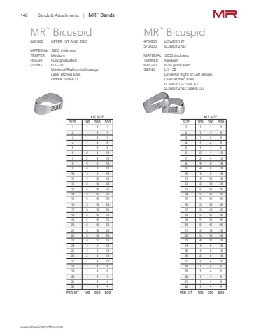 www.americanortho.com140 Bands & Attachments | MR%u2122 BandsMR%u2122Bicuspid560-000 UPPER 1ST AND 2NDMATERIAL .0055 thicknessTEMPER MediumHEIGHT Fully graduatedSIZING U 1 - 32Universal Right or Left designLaser etched sizesUPPER: Size & U KIT SIZESIZE 100 300 5001 1 4 42 1 4 43 1 4 44 1 4 65 1 4 66 2 4 107 2 4 108 4 8 189 4 8 1810 4 8 1811 4 12 1812 5 16 2613 5 16 2614 5 16 2615 5 16 2616 5 16 2617 5 16 2618 5 16 2619 5 16 2620 5 16 2621 5 16 2622 5 16 2623 4 12 1824 4 8 1825 4 8 1826 2 8 1027 1 4 1028 1 4 629 1 4 630 1 4 431 1 4 432 1 4 4PER KIT 100 300 500 KIT SIZESIZE 100 300 5001 1 4 42 1 4 43 1 4 44 1 4 65 1 4 66 2 4 107 2 4 108 4 8 189 4 8 1810 4 8 1811 4 12 1812 5 16 2613 5 16 2614 5 16 2615 5 16 2616 5 16 2617 5 16 2618 5 16 2619 5 16 2620 5 16 2621 5 16 2622 5 16 2623 4 12 1824 4 8 1825 4 8 1826 2 8 1027 1 4 1028 1 4 629 1 4 630 1 4 431 1 4 432 1 4 4PER KIT 100 300 500MR%u2122 Bicuspid470-000 LOWER 1ST570-000 LOWER 2NDMATERIAL .0055 thicknessTEMPER MediumHEIGHT Fully graduatedSIZING L 1 - 32Universal Right or Left designLaser etched sizesLOWER 1ST: Size & LLOWER 2ND: Size & LO