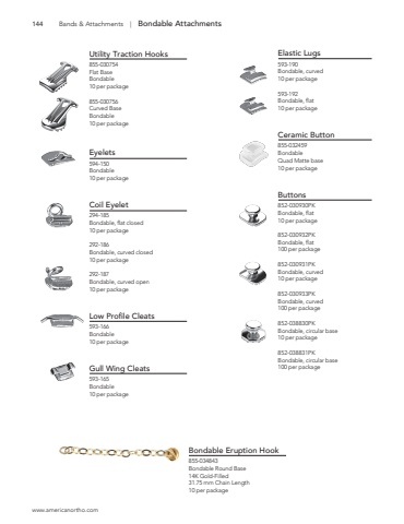 www.americanortho.com144 Bands & Attachments | Bondable AttachmentsUtility Traction Hooks855-030754Flat BaseBondable10 per package855-030756Curved BaseBondable10 per packageEyelets594-150Bondable10 per packageCoil Eyelet294-185Bondable, flat closed10 per package292-186Bondable, curved closed10 per package292-187Bondable, curved open10 per packageLow Profile Cleats593-166Bondable10 per packageGull Wing Cleats593-165Bondable10 per packageBondable Eruption Hook855-034843Bondable Round Base14K Gold-Filled31.75 mm Chain Length10 per packageElastic Lugs593-190Bondable, curved10 per package593-192Bondable, flat10 per packageCeramic Button855-032459BondableQuad Matte base10 per packageButtons852-030930PK Bondable, flat10 per package852-030932PKBondable, flat100 per package852-030931PKBondable, curved10 per package852-030933PKBondable, curved100 per package852-038830PKBondable, circular base10 per package852-038831PKBondable, circular base100 per package