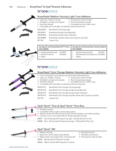 www.americanortho.com148Syringe Kit with BracePaste MTP Primer Syringe Kit with BracePaste Fluoride Sealant020-030089 020-039668 2 BracePaste Syringes (8 g total) 020-026877 2 BracePaste Syringes (8 g total) 020-0268771 Bottle MTP Primer 6 mL 020-029614 1 Bottle BracePaste Fluoride Sealant 6 mL 020-0359935 Spatulas 5 SpatulasBracePaste%u00ae Medium Viscosity Light Cure Adhesive%u2022 Light cure, medium viscosity %u2022 Fluorescence under UV light%u2022 Available in syringes and carpules %u2022 Room temperature storage%u2022 Easy flash cleanup %u2022 Immediate wire tie-in after curing%u2022 Compatible with most light cure sealants and bond enhancers020-026879 BracePaste Trial Syringe (4g)020-026877 BracePaste Syringe 2-pack (8g total)020-026878 BracePaste Syringe 4-pack (16g total)020-026880 BracePaste Carpules, 20 per pack (.3g each, 6g total)001-939 Carpule GunBracePaste%u00ae Color Change Medium Viscosity Light Cure Adhesive%u2022 Color Changing for easy cleanup and enhanced bracket placement%u2022 Light cure, medium viscosity %u2022 Fluorescence under UV light%u2022 Available in syringes and carpules %u2022 Room temperature storage%u2022 Easy flash cleanup %u2022 Immediate wire tie-in after curing%u2022 Compatible with most light cure sealants and bond enhancers020-031573 BracePaste Color Change Trial Syringe (4g)020-033120 BracePaste Color Change Syringe 2-pack (8g total)020-031574 BracePaste Color Change Syringe 4-pack (16g total)020-031575 BracePaste Color Change Carpules, 20 per pack (.3g each, 6g total)001-939 Carpule GunAdhesives | BracePaste%u00ae & Opal%u00ae Bracket AdhesivesOpal%u00ae Bond%u2122 Flow & Opal%u00ae Bond%u2122 Flow Blue%u2022 Flowable viscosity%u2022 Compatible with any light-cured bonding system%u2022 Ideal for permanent retainers, bite ramps, occlusal buildups, and indirect bonding%u2022 Contains a micro-nano hybrid filler for durable strength and wear500041 2pk A2 Syringe Kit (2.3g each syringe) + 20 Opal Bond Flow Tips500082 Blue - 2pk Syringe Kit (2.3g each syringe) + 20 Opal Bond Flow TipsOpal%u00ae Bond%u2122 MV%u2022 Medium viscosity %u2022 Easy flash removal%u2022 Ergonomic contra-angle syringe delivery %u2022 Extended working time%u2022 Butters easily into bracket mesh, minimizing drift %u2022 Fluorescence under UV light500067 8pk Syringe Kit (0.9g each syringe)500066 20pk Compule Refill (0.3g each compule)