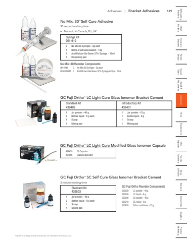 149 Self Ligating Metal Cosmetic Patient Buccal Bands & Adhesives Wire Elastomerics Mini Fixed & Stops Extraoral Instruments Supplies Practice Brackets Brackets Brackets Setups Tubes Attachments Implants Functional & Hooks MarketingAdhesives | Bracket AdhesivesNo Mix: 30TM Self Cure Adhesive30 second working time%u2022 Not sold in Canada, EU, UKSyringe Kit001-9102 No Mix:30 syringes - 5g each1 Bottle of activator/sealant - 15g1 Acid Etchant Gel Green 37% Syringe - 10ml1 Dispensing padNo Mix: 30 Reorder Components001-908 2 No Mix:30 Syringes - 5g each020-028535 1 Acid Etchant Gel Green 37% Syringe & Tips - 10mlGC Fuji OrthoTM LC Light Cure Glass Ionomer Bracket CementStandard Kit Introductory Kit439403 4394011 Jar powder - 40 g 1 Jar powder - 15 g2 Bottles liquid - 8 g each 1 Bottle liquid - 8 g1 Scoop 1 Scoop1 Mixing pad 1 Mixing pad*Opal%u00ae is a Registered Trademark of Ultradent Products, Inc.GC Fuji OrthoTM LC Light Cure Modified Glass Ionomer Capsule439450 50 Capsules437555 Capsule applicatorGC Fuji OrthoTM SC Self Cure Glass Ionomer Bracket Cement3 minute working time Standard Kit 4395031 Jar powder - 40 g2 Bottles liquid - 8 g each1 Scoop1 Mixing padGC Fuji Ortho Reorder Components000029 LC powder - 40 g000030 LC liquid - 8 g000209 SC powder - 40 g000210 SC liquid - 8 g001820 Ortho conditioner - 25 g