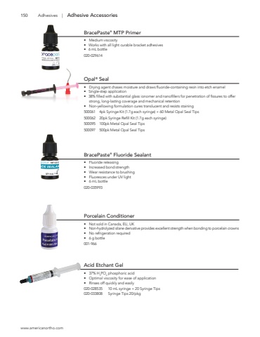 www.americanortho.com150Acid Etchant Gel%u2022 37% H3PO4 phosphoric acid%u2022 Optimal viscosity for ease of application%u2022 Rinses off quickly and easily020-028535 10 mL syringe + 20 Syringe Tips020-033808 Syringe Tips 20/pkgAdhesives | Adhesive AccessoriesBracePaste%u00ae MTP Primer%u2022 Medium viscosity%u2022 Works with all light curable bracket adhesives%u2022 6 mL bottle020-029614 BracePaste%u00ae Fluoride Sealant%u2022 Fluoride releasing%u2022 Increased bond strength%u2022 Wear resistance to brushing%u2022 Fluoresces under UV light%u2022 6 mL bottle020-035993Opal%u00ae Seal%u2022 Drying agent chases moisture and draws fluoride-containing resin into etch enamel%u2022 Single-step application%u2022 38% filled with substantial glass ionomer and nanofillers for penetration of fissures to offerstrong, long-lasting coverage and mechanical retention%u2022 Non-yellowing formulation cures translucent and resists staining500061 4pk Syringe Kit (1.7g each syringe) + 60 Metal Opal Seal Tips500062 20pk Syringe Refill Kit (1.7g each syringe)500095 100pk Metal Opal Seal Tips500097 500pk Metal Opal Seal TipsPorcelain Conditioner%u2022 Not sold in Canada, EU, UK%u2022 Non-hydrolyzed silane derivative provides excellent strength when bonding to porcelain crowns%u2022 No refrigeration required%u2022 6 g bottle001-966