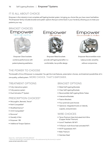16www.americanortho.comSelf Ligating Brackets | Empower%u00ae SystemsIT IS ALL ABOUT CHOICEEmpower is the industry%u2019s most complete self ligating bracket system, bringing you choice like you have never had before. The Empower family includes bracket and system options that put control back in your hands by allowing you to treat your patients your way.BRACKET CHOICESEmpower Clear brackets combine performance with patient-pleasing aesthetics.Empower Metal brackets provide self ligating benefits in a comfortable, low profile design.Empower Reconvertible molar tubes provide versatility without compromise.THE POWER TO CHOOSEThe breadth of line of Empower is unequaled. You get the most features, prescription choices, and treatment possibilities all in one quality, unified system. MORE CHOICE. THAT%u2019S EMPOWER.TREATMENT OPTIONS%u2022 Fully interactive system%u2022 Fully passive system%u2022 Dual Activation%u2122 SystemPRESCRIPTION CHOICES*%u2022 McLaughlin, Bennett, Trevisi*%u2022 Roth Compatible*%u2022 Modified Damon*%u2022 CCO Compatible*%u2022 Roncone*%u2022 Gianelly V-Slot%u2022 Empower 128%u2022 Additional Torque Options BRACKET OPTIONS%u2022 Metal Self Ligating Brackets%u2022 Clear Self Ligating Brackets%u2022 Reconvertible Self Ligating Molar Tubes%u2022 Interactive Brackets%u2022 Passive Brackets%u2022 Four premolar pad choices%u2022 Optional, integrated hooks on laterals, cuspids, and premolarsWIRE CHOICES%u2022 Tanzo Premium Heat Activated Arch Wire(Copper Nickel Titanium)%u2022 Iconix%u00ae Aesthetic SE NiTi%u2022 TriTanium multi-force heat activated NiTi%u2022 NT3%u00ae Superelastic NiTi%u2022 Beta Titanium%u2022 Stainless Steel* American Orthodontics%u2019 prescription versions. No endorsement by the doctor(s) is implied.Patent No.: 10,912,630; D797,294; D820,457