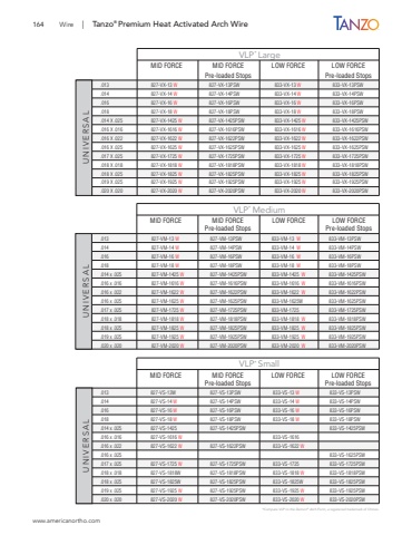 www.americanortho.com164VLP* LargeMID FORCE MID FORCE LOW FORCE LOW FORCEPre-loaded Stops Pre-loaded Stops.013 827-VX-13 W 827-VX-13PSW 833-VX-13 W 833-VX-13PSW.014 827-VX-14 W 827-VX-14PSW 833-VX-14 W 833-VX-14PSW.016 827-VX-16 W 827-VX-16PSW 833-VX-16 W 833-VX-16PSW.018 827-VX-18 W 827-VX-18PSW 833-VX-18 W 833-VX-18PSW.014 X .025 827-VX-1425 W 827-VX-1425PSW 833-VX-1425 W 833-VX-1425PSW.016 X .016 827-VX-1616 W 827-VX-1616PSW 833-VX-1616 W 833-VX-1616PSW.016 X .022 827-VX-1622 W 827-VX-1622PSW 833-VX-1622 W 833-VX-1622PSW.016 X .025 827-VX-1625 W 827-VX-1625PSW 833-VX-1625 W 833-VX-1625PSW.017 X .025 827-VX-1725 W 827-VX-1725PSW 833-VX-1725 W 833-VX-1725PSW.018 X .018 827-VX-1818 W 827-VX-1818PSW 833-VX-1818 W 833-VX-1818PSW.018 X .025 827-VX-1825 W 827-VX-1825PSW 833-VX-1825 W 833-VX-1825PSW.019 X .025 827-VX-1925 W 827-VX-1925PSW 833-VX-1925 W 833-VX-1925PSW.020 X .020 827-VX-2020 W 827-VX-2020PSW 833-VX-2020 W 833-VX-2020PSWVLP* Medium MID FORCE MID FORCE LOW FORCE LOW FORCE Pre-loaded Stops Pre-loaded Stops.013 827-VM-13 W 827-VM-13PSW 833-VM-13 W 833-VM-13PSW.014 827-VM-14 W 827-VM-14PSW 833-VM-14 W 833-VM-14PSW.016 827-VM-16 W 827-VM-16PSW 833-VM-16 W 833-VM-16PSW.018 827-VM-18 W 827-VM-18PSW 833-VM-18 W 833-VM-18PSW.014 x .025 827-VM-1425 W 827-VM-1425PSW 833-VM-1425 W 833-VM-1425PSW.016 x .016 827-VM-1616 W 827-VM-1616PSW 833-VM-1616 W 833-VM-1616PSW.016 x .022 827-VM-1622 W 827-VM-1622PSW 833-VM-1622 W 833-VM-1622PSW.016 x .025 827-VM-1625 W 827-VM-1625PSW 833-VM-1625W 833-VM-1625PSW.017 x .025 827-VM-1725 W 827-VM-1725PSW 833-VM-1725 833-VM-1725PSW.018 x .018 827-VM-1818 W 827-VM-1818PSW 833-VM-1818 W 833-VM-1818PSW.018 x .025 827-VM-1825 W 827-VM-1825PSW 833-VM-1825 W 833-VM-1825PSW.019 x .025 827-VM-1925 W 827-VM-1925PSW 833-VM-1925 W 833-VM-1925PSW.020 x .020 827-VM-2020 W 827-VM-2020PSW 833-VM-2020 W 833-VM-2020PSWVLP* Small MID FORCE MID FORCE LOW FORCE LOW FORCE Pre-loaded Stops Pre-loaded Stops.013 827-VS-13W 827-VS-13PSW 833-VS-13 W 833-VS-13PSW.014 827-VS-14 W 827-VS-14PSW 833-VS-14 W 833-VS-14PSW.016 827-VS-16 W 827-VS-16PSW 833-VS-16 W 833-VS-16PSW.018 827-VS-18 W 827-VS-18PSW 833-VS-18 W 833-VS-18PSW.014 x .025 827-VS-1425 827-VS-1425PSW 833-VS-1425PSW.016 x .016 827-VS-1616 W 833-VS-1616.016 x .022 827-VS-1622 W 827-VS-1622PSW 833-VS-1622 W.016 x .025 833-VS-1625PSW.017 x .025 827-VS-1725 W 827-VS-1725PSW 833-VS-1725 833-VS-1725PSW.018 x .018 827-VS-1818W 827-VS-1818PSW 833-VS-1818 W 833-VS-1818PSW.018 x .025 827-VS-1825W 827-VS-1825PSW 833-VS-1825W 833-VS-1825PSW.019 x .025 827-VS-1925 W 827-VS-1925PSW 833-VS-1925 W 833-VS-1925PSW.020 x .020 827-VS-2020 W 827-VS-2020PSW 833-VS-2020 W 833-VS-2020PSW*Compare VLP to the Damon%u00ae Arch Form, a registered trademark of Ormco.UNIVERSAL UNIVERSAL UNIVERSALWire | Tanzo%u00ae Premium Heat Activated Arch Wire