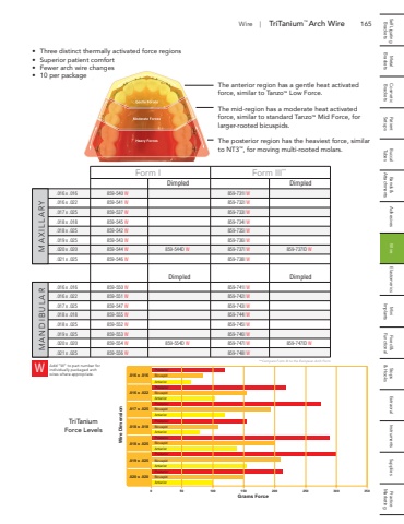 165 Self Ligating Metal Cosmetic Patient Buccal Bands & Adhesives Wire Elastomerics Mini Fixed & Stops Extraoral Instruments Supplies Practice Brackets Brackets Brackets Setups Tubes Attachments Implants Functional & Hooks MarketingWire DimensionGrams Force0 50 100 150 200 250 300 350.019 x .025.018 x .025.017 x .025.016 x .022.020 x .020.018 x .018.016 x .016PosteriorBicuspidAnteriorPosteriorBicuspidAnteriorPosteriorBicuspidAnteriorPosteriorBicuspidAnteriorPosteriorBicuspidAnteriorPosteriorBicuspidAnteriorPosteriorBicuspidAnteriorWire | TriTanium%u2122 Arch WireForm I Form III**Dimpled Dimpled.016 x .016 859-540 W 859-731I W.016 x .022 859-541 W 859-732I W.017 x .025 859-537 W 859-733I W.018 x .018 859-545 W 859-734I W.018 x .025 859-542 W 859-735I W.019 x .025 859-543 W 859-736I W.020 x .020 859-544 W 859-544D W 859-737I W 859-737ID W.021 x .025 859-546 W 859-738I WDimpled Dimpled.016 x .016 859-550 W 859-741I W.016 x .022 859-551 W 859-742I W.017 x .025 859-547 W 859-743I W.018 x .018 859-555 W 859-744I W.018 x .025 859-552 W 859-745I W.019 x .025 859-553 W 859-746I W.020 x .020 859-554 W 859-554D W 859-747I W 859-747ID W.021 x .025 859-556 W 859-748I WW Add %u201cW%u201d to part number for individually packaged archwires where appropriate.TriTaniumForce Levels%u2022 Three distinct thermally activated force regions%u2022 Superior patient comfort%u2022 Fewer arch wire changes%u2022 10 per packageThe anterior region has a gentle heat activated force, similar to Tanzo%u2122 Low Force.The mid-region has a moderate heat activated force, similar to standard Tanzo%u2122 Mid Force, for larger-rooted bicuspids.The posterior region has the heaviest force, similar to NT3%u2122, for moving multi-rooted molars.**Compare Form III to the European Arch FormMAXILLARY MANDIBULAR