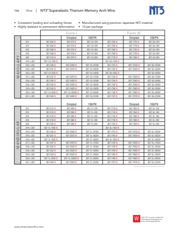 www.americanortho.com166 Wire | NT3%u00ae Superelastic Titanium Memory Arch Wire%u2022 Consistent loading and unloading forces %u2022 Manufactured using premium Japanese NiTi material%u2022 Highly resistant to permanent deformation %u2022 10 per package MAXILLARY MANDIBULAR Form I Form III* Dimpled 100/PK Dimpled 100/PK.012 857-502 W 857-573 W 857-1U-12H 857-702I W 857-772I W 857-3U-12H.014 857-504 W 857-574 W 857-1U-14H 857-704I W 857-774I W 857-3U-14H.016 857-506 W 857-576 W 857-1U-16H 857-706I W 857-776I W 857-3U-16H.018 857-508 W 857-578 W 857-1U-18H 857-708I W 857-778I W 857-3U-18H.020 857-510 W 857-579 W 857-1U-20H 857-710I W 857-780I W 857-3U-20H.014 x .025 857-1U-1425 W 857-3U-1425 W .016 x .016 857-540 W 857-540D W 857-1U-1616H 857-731I W 857-731ID W 857-3U-1616H.016 x .022 857-541 W 857-541D W 857-1U-1622H 857-732I W 857-732ID W 857-3U-1622H.016 x .025 857-1U-1625 W 857-1U-1625H 857-3U-1625 W 857-3U-1625H.017 x .025 857-537 W 857-537D W 857-1U-1725H 857-733I W 857-733ID W 857-3U-1725H.018 x .018 857-545 W 857-545D W 857-1U-1818H 857-734I W 857-734ID W 857-3U-1818H.018 x .025 857-542 W 857-542D W 857-1U-1825H 857-735I W 857-735ID W 857-3U-1825H.019 x .025 857-543 W 857-543D W 857-1U-1925H 857-736I W 857-736ID W 857-3U-1925H.020 x .020 857-1U-2020 W 857-1U-2020D W 857-1U-2020H 857-738I W 857-738ID W 857-3U-2020H.021 x .025 857-544 W 857-544D W 857-1U-2125H 857-737I W 857-737ID W 857-3U-2125H Dimpled 100/PK Dimpled 100/PK.012 857-512 W 857-583 W 857-1L-12H 857-712I W 857-782I W 857-3L-12H.014 857-514 W 857-584 W 857-1L-14H 857-714I W 857-784I W 857-3L-14H.016 857-516 W 857-586 W 857-1L-16H 857-716I W 857-786I W 857-3L-16H.018 857-518 W 857-588 W 857-1L-18H 857-718I W 857-788I W 857-3L-18H.020 857-520 W 857-589 W 857-1L-20H 857-720I W 857-790I W 857-3L-20H.014 x .025 857-1L-1425 W 857-3L-1425 W .016 x .016 857-550 W 857-550D W 857-1L-1616H 857-741I W 857-741ID W 857-3L-1616H.016 x .022 857-551 W 857-551D W 857-1L-1622H 857-742I W 857-742ID W 857-3L-1622H.016 x .025 857-1L-1625 W 857-1L-1625H 857-3L-1625 W 857-3L-1625H.017 x .025 857-547 W 857-547D W 857-1L-1725H 857-743I W 857-743ID W 857-3L-1725H.018 x .018 857-555 W 857-555D W 857-1L-1818H 857-744I W 857-744ID W 857-3L-1818H.018 x .025 857-552 W 857-552D W 857-1L-1825H 857-745I W 857-745ID W 857-3L-1825H.019 x .025 857-553 W 857-553D W 857-1L-1925H 857-746I W 857-746ID W 857-3L-1925H.020 x .020 857-1L-2020 W 857-1L-2020D W 857-1L-2020H 857-748I W 857-748ID W 857-3L-2020H.021 x .025 857-554 W 857-554D W 857-1L-2125H 857-747I W 857-747ID W 857-3L-2125H*Compare Form III to the European Arch FormW Add %u201cW%u201d to part number for individually packaged archwires where appropriate.