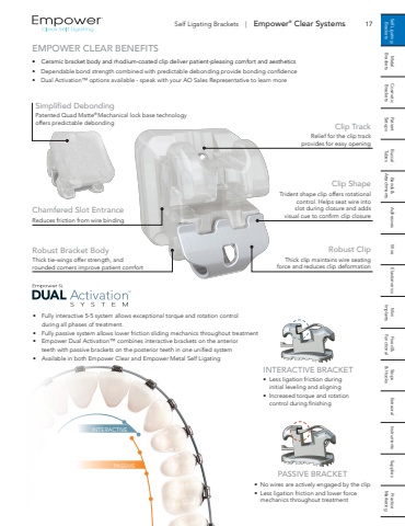 17 Self Ligating Metal Cosmetic Patient Buccal Bands & Adhesives Wire Elastomerics Mini Fixed & Stops Extraoral Instruments Supplies Practice Brackets Brackets Brackets Setups Tubes Attachments Implants Functional & Hooks MarketingSelf Ligating Brackets | Empower%u00ae Clear SystemsINTERACTIVEPASSIVEINTERACTIVE BRACKET%u2022 Less ligation friction duringinitial leveling and aligning%u2022 Increased torque and rotationcontrol during finishingPASSIVE BRACKET%u2022 No wires are actively engaged by the clip%u2022 Less ligation friction and lower forcemechanics throughout treatment%u2022 Fully interactive 5-5 system allows exceptional torque and rotation control during all phases of treatment.%u2022 Fully passive system allows lower friction sliding mechanics throughout treatment%u2022 Empower Dual Activation%u2122 combines interactive brackets on the anteriorteeth with passive brackets on the posterior teeth in one unified system%u2022 Available in both Empower Clear and Empower Metal Self LigatingSimplified DebondingPatented Quad Matte%u00ae Mechanical lock base technology offers predictable debondingClip ShapeTrident shape clip offers rotational control. Helps seat wire into slot during closure and adds visual cue to confirm clip closureClip TrackRelief for the clip track provides for easy openingRobust Bracket BodyThick tie-wings offer strength, and rounded corners improve patient comfortChamfered Slot EntranceReduces friction from wire bindingRobust ClipThick clip maintains wire seating force and reduces clip deformationEMPOWER CLEAR BENEFITS %u2022 Ceramic bracket body and rhodium-coated clip deliver patient-pleasing comfort and aesthetics%u2022 Dependable bond strength combined with predictable debonding provide bonding confidence%u2022 Dual Activation%u2122 options available - speak with your AO Sales Representative to learn more