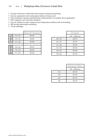 www.americanortho.com176%u2022 Unique chromium cobalt alloy with superior physical properties%u2022 Can be easily bent and manipulated without fracture risk%u2022 Heat treated to elevate spring/tensile characteristics for greater force application%u2022 Non-magnetic and corrosion resistant%u2022 Can be welded to other metal at low temperature without risk of annealing%u2022 Will accept electrolytic polishing%u2022 10 per package Bonwill Hawley.016 x .016 854-801.016 x .022 854-802.017 x .025 854-806.016 x .016 854-821.016 x .022 854-822.017 x .025 854-826MAX MANDWire | Multiphase Blue Chromium Cobalt Wire Straight 14\.016 x .016 854-701.016 x .022 854-702.017 x .022 854-705.017 x .025 854-706.018 x .022 854-708.018 x .025 854-709 Retainer Wire 14\.028 854-728.030 854-730.032 854-732.036 854-736