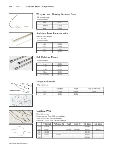 www.americanortho.com178Wrap Around Hawley Retainer Form.032 wire diameter10 per packageSmall 855-237Medium 855-236Large 855-238Stainless Steel Retainer WireMedium hard temper14\10 per package.025 856-825.030 856-830.032 856-832.036 856-836Ball Retainer Clasps10 per package.6 mm 855-256.7 mm 855-257.8 mm 855-2581.0 mm 855-259Kit of 50 Assorted 855-255Kobayashi Hooks100 per package Standard Twist Twist Tooth Color.012 855-634 855-638 855-637.014 855-635 855-636Ligature WireDead soft temperPreformed and Twist: 1000 per packageTwist Tooth Color: 100 per packagePreformed Tooth Color: 100 per package Preformed Preformed TC Twist Twist TC 1Lb Spool 5Lb Spool.009 855-620 855-640.010 855-621 855-628 855-628TC 855-651 855-652.011 855-622 855-660.012 855-623 855-619 855-670.014 855-680Wire | Stainless Steel Components