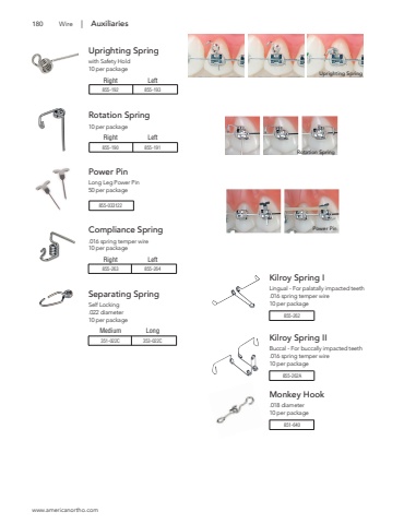 www.americanortho.com180 Wire | AuxiliariesPower PinUprighting Springwith Safety Hold10 per packageRight Left855-192 855-193Rotation Spring10 per packageRight Left855-190 855-191Power PinLong Leg Power Pin50 per package855-033122Compliance Spring.016 spring temper wire10 per packageRight Left855-263 855-264Separating SpringSelf Locking.022 diameter10 per packageMedium Long351-022C 353-022CKilroy Spring ILingual - For palatally impacted teeth.016 spring temper wire10 per package855-262Kilroy Spring IIBuccal - For buccally impacted teeth.016 spring temper wire10 per package855-262AMonkey Hook.018 diameter10 per package851-640Uprighting SpringRotation Spring