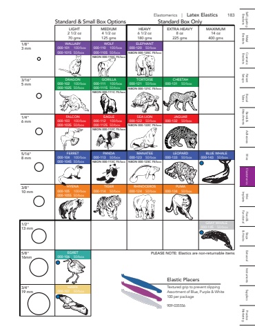 183 Self Ligating Metal Cosmetic Patient Buccal Bands & Adhesives Wire Elastomerics Mini Fixed & Stops Extraoral Instruments Supplies Practice Brackets Brackets Brackets Setups Tubes Attachments Implants Functional & Hooks MarketingElastomerics | Latex ElasticsElastic PlacersTextured grip to prevent slippingAssortment of Blue, Purple & White100 per package 909-035556PLEASE NOTE: Elastics are non-returnable items1/8\3 mm3/16\5 mm1/4\6 mm5/16\8 mm3/8\10 mm1/2\13 mm5/8\16mm3/4\19 mmLIGHT MEDIUM HEAVY EXTRA HEAVY MAXIMUM2 1/2 oz 4 1/2 oz 6 1/2 oz 8 oz 14 oz70 gms 125 gms 180 gms 225 gms 400 gmsWALLABY000-101 100/box000-101S 50/boxDRAGON000-102 100/box000-102S 50/boxFALCON000-103 100/box000-103S 50/boxFERRET000-104 100/box000-104S 50/boxHYENA000-105 100/box000-105S 50/boxWOLF000-110 100/box000-110S 50/boxNEON 000-110C 75/boxNEON 000-111C 75/boxNEON 000-112C 75/boxNEON 000-113C 75/boxNEON 000-120C 75/boxNEON 000-121C 75/boxNEON 000-122C 75/boxNEON 000-123C 75/boxGORILLA000-111 100/box000-111S 50/boxEAGLE000-112 100/box000-112S 50/boxPANDA000-113 50/boxTIGER000-114 50/boxELEPHANT000-120 50/boxTORTOISE000-121 50/boxSEA LION000-122 50/boxMANATEE000-123 50/boxRHINOCEROS000-124 50/boxCHEETAH000-131 50/boxJAGUAR000-132 50/boxLEOPARD000-133 50/boxPUMA000-134 50/boxEGRET000-106 50/boxHAWK000-107 50/boxGRAY WHALE000-145 50/boxBLUE WHALE000-143 50/boxStandard & Small Box Options Standard Box Only