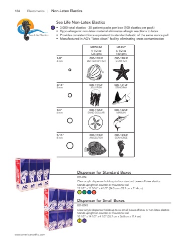 www.americanortho.com184 Elastomerics | Non-Latex ElasticsMEDIUM HEAVY4 1/2 oz 6 1/2 oz125 gms 180 gms1/8\000-110LF 000-120LF3 mm BUTTERFLY FISH STARFISH3/16\000-111LF 000-121LF5 mm JELLYFISH STINGRAY1/4\000-112LF 000-122LF6 mm SAND DOLLAR MARLIN5/16\000-113LF 000-123LF8 mm ANGELFISH SEAHORSEDispenser for Standard Boxes851-824Clear acrylic dispenser holds up to four standard boxes of latex elasticsStands upright on counter or mounts to wall13 1/2\Dispenser for Small Boxes851-824SClear acrylic dispenser holds up to six small boxes of latex or non-latex elasticsStands upright on counter or mounts to wall10 1/2%u201d x 14 1/2%u201d x 4 1/2%u201d (26.7 cm x 36.8 cm x 11.4 cm)Sea Life ElasticsSea Life Non-Latex Elastics%u2022 3,000 total elastics - 30 patient packs per box (100 elastics per pack)%u2022 Hypo-allergenic non-latex material eliminates allergic reactions to latex%u2022 Provides consistent force equivalent to standard elastic of the same ounce pull%u2022 Manufactured in AO%u2019s %u201clatex clean%u201d facility, eliminating cross contamination