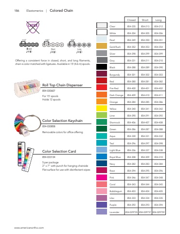 www.americanortho.com186Closed Short LongClear 854-235 854-213 854-212White 854-304 854-305 854-306Pearl 854-349 854-350 854-351Gold Rush 854-352 854-353 854-354Silver 854-298 854-299 854-399Gray 854-231 854-211 854-210Black 854-288 854-289 854-390Burgundy 854-301 854-302 854-303Red 854-280 854-281 854-382Fire Red 854-400 854-401 854-402Dark Orange 854-409 854-410 854-411Orange 854-284 854-285 854-386Yellow 854-340 854-341 854-342Lime 854-290 854-291 854-392Shamrock 854-406 854-407 854-408Green 854-286 854-287 854-388 Aqua 854-330 854-331 854-332Teal 854-296 854-297 854-398Light Blue 854-336 854-337 854-338Royal Blue 854-308 854-309 854-310Navy 854-282 854-283 854-384Rose 854-294 854-295 854-396Pink 854-346 854-347 854-348Coral 854-343 854-344 854-345Bubblegum 854-403 854-404 854-405Lilac 854-333 854-334 854-335Purple 854-292 854-293 854-394Lavender 854-029755 854-029757 854-029759Roll Top Chain Dispenser 854-030607For 15' spoolsHolds 12 spoolsColor Selection Keychain 854-030858Removable colors for office offeringColor Selection Card 854-0331345 per package2\Flat surface for use with disinfectant wipesOffering a consistent force in closed, short, and long filaments,chain is color matched with ligatures. Available in 15' (4.6 m) spools.Elastomerics | Colored ChainCLEARWHITEPEARLGOLD RUSHSILVERGRAYBLACKBURGUNDYREDFIRE REDDARK ORANGEORANGEYELLOWLIMESHAMROCKGREENAQUATEALLIGHT BLUEROYAL BLUENAVYROSEPINKCORALBUBBLEGUMLILACPURPLELAVENDERREF 854-033134AMERICAN O R T H ODONTICSCLEARWHITEPEARLGOLD RUSHSILVERGRAYBLACKBURGUNDYREDFIRE REDDARK ORANGEORANGEYELLOWLIMESHAMROCKGREENAQUATEALLIGHT BLUEROYAL BLUENAVYROSEPINKCORALBUBBLEGUMLILACPURPLELAVENDERREF 854-033134AMERICAN O R T H ODONTICS
