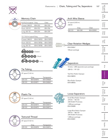 187 Self Ligating Metal Cosmetic Patient Buccal Bands & Adhesives Wire Elastomerics Mini Fixed & Stops Extraoral Instruments Supplies Practice Brackets Brackets Brackets Setups Tubes Attachments Implants Functional & Hooks Marketing.113\.160\.200\Memory Chain6.6 ft (2 m) spool Gray ClearClosed .048 ID 854-252 854-255Short .052 ID 854-253 854-256Long .067 ID 854-254 854-25913.1 ft (4 m) spoolGray ClearClosed .048 ID 854-018933 854-018932Short .052 ID 854-018936 854-018935Long .067 ID 854-018938 854-018937Closed Short LongTie Tubing25%u2019 spool (7.62 m)Gray Transparent.025 OD 854-034070 854-034068.030 OD 854-034071 854-034069Plastic Tie25%u2019 spool (7.62 m)Gray Transparent.025 OD 854-034074 854-034072.030 OD 854-034075 854-034073Textured Thread25%u2019 spool (7.62 m)Gray Transparent.025 OD 854-034078 854-034076Elastomerics | Chain, Tubing and Tie, SeparatorsArch Wire Sleeve10' spool (3.05 m).030 IDGray Clear.065 OD 854-540 854-035501Clear Rotation Wedges854-034067100 per packageSeparators10 stick, 1,000 separators per package.089 ID / .197 ODTeal Non Radio Opaque854-038055Blue Radio Opaque854-038056Loose SeparatorsSmall Blue Radio Opaque.070 ID / .150 OD.040 Width/Thickness1,000 per package854-034080Large Blue Radio Opaque.094 ID / .188 OD .045 Width/Thickness1,000 per package854-034081