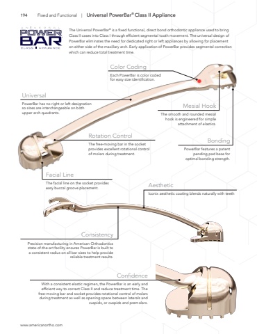 www.americanortho.com194Color CodingEach PowerBar is color coded for easy size identification.Mesial HookThe smooth and rounded mesialhook is engineered for simple attachment of elastics.BondingPowerBar features a patent pending pad base for optimal bonding strength.Rotation ControlThe free-moving bar in the socketprovides excellent rotational control of molars during treatment.Facial LineThe facial line on the socket provideseasy buccal groove placement.The Universal PowerBar%u00ae is a fixed functional, direct bond orthodontic appliance used to bring Class II cases into Class I through efficient segmental tooth movement. The universal design of PowerBar eliminates the need for dedicated right or left appliances by allowing for placement on either side of the maxillary arch. Early application of PowerBar provides segmental correction which can reduce total treatment time. ConsistencyPrecision manufacturing in American Orthodontics state-of-the-art facility ensures PowerBar is built to a consistent radius on all bar sizes to help provide reliable treatment results.AestheticIconix aesthetic coating blends naturally with teethConfidenceWith a consistent elastic regimen, the PowerBar is an early and efficient way to correct Class II and reduce treatment time. The free-moving bar and socket provides rotational control of molars during treatment as well as opening space between laterals and cuspids, or cuspids and premolars.UniversalPowerBar has no right or left designation so sizes are interchangeable on both upper arch quadrants.Fixed and Functional | Universal PowerBar%u00ae Class II Appliance