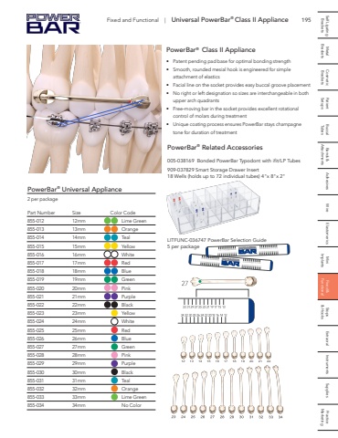 195 Self Ligating Metal Cosmetic Patient Buccal Bands & Adhesives Wire Elastomerics Mini Fixed & Stops Extraoral Instruments Supplies Practice Brackets Brackets Brackets Setups Tubes Attachments Implants Functional & Hooks MarketingAestheticIconix aesthetic coating blends naturally with teethPowerBar%u00ae Class II Appliance%u2022 Patent pending pad base for optimal bonding strength%u2022 Smooth, rounded mesial hook is engineered for simple attachment of elastics%u2022 Facial line on the socket provides easy buccal groove placement%u2022 No right or left designation so sizes are interchangeable in both upper arch quadrants%u2022 Free-moving bar in the socket provides excellent rotational control of molars during treatment %u2022 Unique coating process ensures PowerBar stays champagne tone for duration of treatmentPowerBar%u00ae Universal Appliance2 per packagePart Number Size Color Code855-012 12mm Lime Green 855-013 13mm Orange855-014 14mm Teal855-015 15mm Yellow855-016 16mm White855-017 17mm Red855-018 18mm Blue855-019 19mm Green855-020 20mm Pink855-021 21mm Purple855-022 22mm Black855-023 23mm Yellow855-024 24mm White855-025 25mm Red855-026 26mm Blue855-027 27mm Green855-028 28mm Pink855-029 29mm Purple855-030 30mm Black855-031 31mm Teal855-032 32mm Orange855-033 33mm Lime Green855-034 34mm No ColorPowerBar%u00ae Related Accessories005-038169 Bonded PowerBar Typodont with ifit/LP Tubes909-037829 Smart Storage Drawer Insert18 Wells (holds up to 72 individual tubes) 4\LITFUNC-036747 PowerBar Selection Guide5 per packageFixed and Functional | Universal PowerBar%u00ae Class II Appliance
