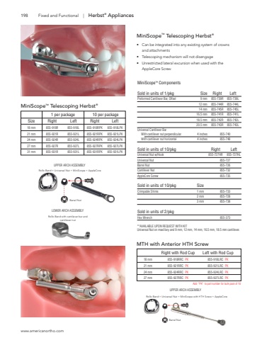 www.americanortho.com198Barrel NutFixed and Functional | Herbst%u00ae AppliancesRollo Band + Universal Nut + MiniScope + AppleCoreRollo Band with cantilever bar and cantilever nutUPPER ARCH ASSEMBLYBarrel NutRollo Band + Universal Nut + MiniScope with HTH Screw + AppleCoreUPPER ARCH ASSEMBLYLOWER ARCH ASSEMBLYMiniScopeTM Telescoping Herbst%u00ae1 per package 10 per packageSize Right Left Right Left18 mm 855-918R 855-918L 855-918RPK 855-918LPK21 mm 855-921R 855-921L 855-921RPK 855-921LPK24 mm 855-924R 855-924L 855-924RPK 855-924LPK27 mm 855-927R 855-927L 855-927RPK 855-927LPK31 mm 855-931R 855-931L 855-931RPK 855-931LPKMTH with Anterior HTH Screw Right with Rod Cup Left with Rod Cup18 mm 855-918RRC PK 855-918LRC PK21 mm 855-921RRC PK 855-921LRC PK24 mm 855-924RRC PK 855-924LRC PK27 mm 855-927RRC PK 855-927LRC PKMiniScope%u2122 ComponentsSold in units of 1/pkg Size Right LeftPreformed Cantilever Bar, Offset 9 mm 855-739R 855-739L 12 mm 855-744R 855-744L 14 mm 855-745R 855-745L 16.5 mm 855-741R 855-741L 18.5 mm 855-742R 855-742L 20.5 mm 855-743R 855-743LUniversal Cantilever Bar With cantilever nut perpendicular 4 inches 855-740With cantilever nut horizontal 4 inches 855-748Sold in units of 10/pkg Right LeftUniversal Nut w/Hook 855-727HR 855-727HLUniversal Nut 855-727Barrel Nut 855-726Cantilever Nut 855-732AppleCore Screw 855-735Sold in units of 10/pkg SizeCrimpable Shims 1 mm 855-733 2 mm 855-728 3 mm 855-738Sold in units of 2/pkgHex Wrench 855-373MiniScopeTM Telescoping Herbst%u00ae%u2022 Can be integrated into any existing system of crowns and attachments%u2022 Telescoping mechanism will not disengage%u2022 Unrestricted lateral excursion when used with theAppleCore Screw**AVAILABLE UPON REQUEST WITH KITUniversal Nut on maxillary and 9 mm, 12 mm, 14 mm, 16.5 mm, 18.5 mm cantilever. Add \