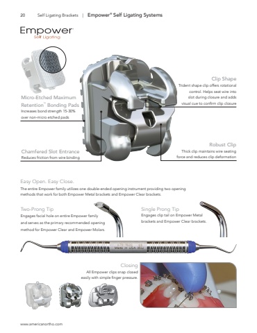 20www.americanortho.comSelf Ligating Brackets | Empower%u00ae Self Ligating SystemsMicro-Etched Maximum Retention%u2122 Bonding PadsIncreases bond strength 15-30% over non-micro etched padsChamfered Slot EntranceReduces friction from wire bindingRobust ClipThick clip maintains wire seating force and reduces clip deformationEasy Open. Easy Close.The entire Empower family utilizes one double-ended opening instrument providing two opening methods that work for both Empower Metal brackets and Empower Clear brackets.Single Prong TipEngages clip tail on Empower Metal brackets and Empower Clear brackets.ClosingAll Empower clips snap closed easily with simple finger pressure.Two-Prong TipEngages facial hole on entire Empower family and serves as the primary recommended opening method for Empower Clear and Empower Molars.Clip ShapeTrident shape clip offers rotational control. Helps seat wire into slot during closure and adds visual cue to confirm clip closure