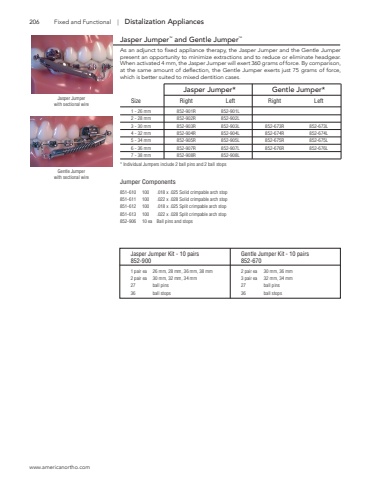 www.americanortho.com206 Fixed and Functional | Distalization AppliancesJasper JumperTM and Gentle JumperTMAs an adjunct to fixed appliance therapy, the Jasper Jumper and the Gentle Jumper present an opportunity to minimize extractions and to reduce or eliminate headgear. When activated 4 mm, the Jasper Jumper will exert 360 grams of force. By comparison, at the same amount of deflection, the Gentle Jumper exerts just 75 grams of force, which is better suited to mixed dentition cases.Jasper Jumper* Gentle Jumper*Size Right Left Right Left1 - 26 mm 852-901R 852-901L2 - 28 mm 852-902R 852-902L3 - 30 mm 852-903R 852-903L 852-673R 852-673L4 - 32 mm 852-904R 852-904L 852-674R 852-674L5 - 34 mm 852-905R 852-905L 852-675R 852-675L6 - 36 mm 852-907R 852-907L 852-676R 852-676L7 - 38 mm 852-908R 852-908L* Individual Jumpers include 2 ball pins and 2 ball stopsJumper Components851-610 100 .018 x .025 Solid crimpable arch stop851-611 100 .022 x .028 Solid crimpable arch stop851-612 100 .018 x .025 Split crimpable arch stop851-613 100 .022 x .028 Split crimpable arch stop852-906 10 ea Ball pins and stopsJasper Jumper Kit - 10 pairs Gentle Jumper Kit - 10 pairs852-900 852-6701 pair ea 26 mm, 28 mm, 36 mm, 38 mm 2 pair ea 30 mm, 36 mm2 pair ea 30 mm, 32 mm, 34 mm 3 pair ea 32 mm, 34 mm27 ball pins 27 ball pins36 ball stops 36 ball stopsJasper Jumperwith sectional wireGentle Jumperwith sectional wire
