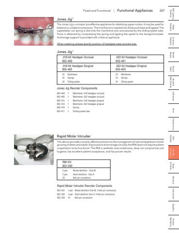 207 Self Ligating Metal Cosmetic Patient Buccal Bands & Adhesives Wire Elastomerics Mini Fixed & Stops Extraoral Instruments Supplies Practice Brackets Brackets Brackets Setups Tubes Attachments Implants Functional & Hooks MarketingFixed and Functional | Functional AppliancesJones JigTMThe Jones Jig is a simple, but effective appliance for distalizing upper molars. It may be used for bilateral or unilateral corrections. The mainframe is inserted into the buccal tube and ligated. The superelastic coil spring is slid onto the mainframe wire and secured by the sliding eyelet tube. Force is obtained by compressing the spring and ligating the eyelet to the bicuspid bracket. Anchorage support is provided with a Nance appliance.When ordering, please specify position of headgear tube and slot size.Jones JigTM.018 Kit Headgear Occlusal .022 Kit Headgear Occlusal855-400 855-401.018 Kit Headgear Gingival .022 Kit Headgear Gingival855-402 855-40320 Mainframes 20 Mainframes20 Springs 20 Springs20 Sliding eyelets 20 Sliding eyeletsJones Jig Reorder Components855-404 1 Mainframe .018 headgear occlusal855-405 1 Mainframe .022 headgear occlusal855-412 1 Mainframe .018 headgear gingival855-413 1 Mainframe .022 headgear gingival855-410 1 Spring855-411 1 Sliding eyelet tubeRapid Molar IntruderThis device provides a simple, effective solution to the management of vertical dysplasias in both growing children and adults. Easy to place and manage clinically, the RMI does not require patient cooperation to be functional. The RMI is aesthetic and unobtrusive, does not compromise oral hygiene, has excellent patient acceptance, and has proven results.RMI Kit852-2003 pair Mixed dentition - Size M2 pair Adult dentition - Size A20 Ball pin connectorsRapid Molar Intruder Reorder Components852-201 1 pair Mixed dentition Size M, 4 ball pin connectors852-202 1 pair Adult dentition Size A, 4 ball pin connectors852-203 10 Ball pin connectors