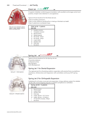 www.americanortho.com208 Fixed and Functional | Jet FamilyDistal JetA superior distalizer combining pure translation with excellent anchorage control and positive, simple molar retention in one appliance.Typical clinical situations for the Distal Jet are:Class II maxillary protrusionClass II molar relations resulting from missing or blocked out teethClass II subdivision (unilateral) casesDistal Jet Kit - 5 patients855-50010 Bondable connectors5 Transpalatal connectors10 Bayonet directors10 Standard bayonets10 NiTi springs - 240 gm10 NiTi springs - 180 gm10 Lingual sheaths10 Activation locks10 Distal stops1 Hex wrenchDistal Jet can be anchored to 2nd bicuspid in cases requiring maximum anterior anchorage control.Spring Jet 1 for Dental ExpansionThe replacement for all existing wireform expanders with precise force-counterforcemechanics. Achieve slow arch expansion with controlled, continuous NiTi spring force.Spring Jet 2 for Orthopedic ExpansionSubstitute for all screw or pre-set wire expanders. Unique delivery system for reliable results with minimal tipping requires no patient compliance or activation.Spring JetTypical clinical situations for the Spring Jet are:Cross-bite relationsCollapsed archesMicrognathiaArch developmentSpring Jet Kit - 5 patients855-52010 Bayonet directors10 Lingual sheaths10 Activation locks10 Distal stops10 Lengths .036 wire - 4.5\10 Lengths .045 wire - 3.5\1 15\1 Hex wrenchSpring Jet 1 - Dental expansionSpring Jet 2 - Orthopedic expansion