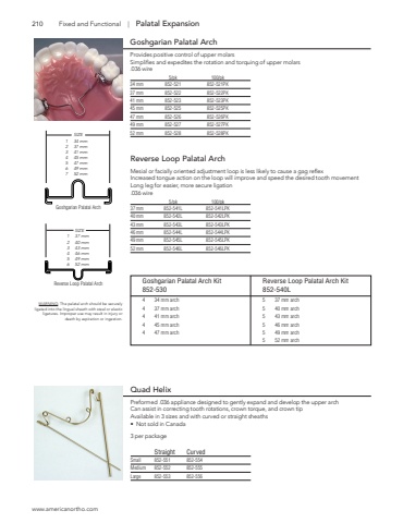 www.americanortho.com210 SIZE1 34 mm2 37 mm3 41 mm4 45 mm5 47 mm6 49 mm7 52 mm SIZE1 37 mm2 40 mm3 43 mm4 46 mm5 49 mm6 52 mmFixed and Functional | Palatal ExpansionGoshgarian Palatal ArchProvides positive control of upper molarsSimplifies and expedites the rotation and torquing of upper molars.036 wire 5/pk 100/pk34 mm 852-521 852-521PK37 mm 852-522 852-522PK41 mm 852-523 852-523PK45 mm 852-525 852-525PK47 mm 852-526 852-526PK49 mm 852-527 852-527PK52 mm 852-528 852-528PKGoshgarian Palatal Arch Kit Reverse Loop Palatal Arch Kit852-530 852-540L4 34 mm arch 5 37 mm arch4 37 mm arch 5 40 mm arch4 41 mm arch 5 43 mm arch4 45 mm arch 5 46 mm arch4 47 mm arch 5 49 mm arch 5 52 mm archReverse Loop Palatal ArchMesial or facially oriented adjustment loop is less likely to cause a gag reflexIncreased tongue action on the loop will improve and speed the desired tooth movementLong leg for easier, more secure ligation.036 wire 5/pk 100/pk37 mm 852-541L 852-541LPK40 mm 852-542L 852-542LPK43 mm 852-543L 852-543LPK46 mm 852-544L 852-544LPK49 mm 852-545L 852-545LPK52 mm 852-546L 852-546LPKQuad HelixPreformed .036 appliance designed to gently expand and develop the upper archCan assist in correcting tooth rotations, crown torque, and crown tipAvailable in 3 sizes and with curved or straight sheaths%u2022 Not sold in Canada3 per packageStraight CurvedSmall 852-551 852-554Medium 852-552 852-555Large 852-553 852-556Goshgarian Palatal ArchReverse Loop Palatal ArchWARNING: The palatal arch should be securely ligated into the lingual sheath with steel or elastic ligatures. Improper use may result in injury or death by aspiration or ingestion.