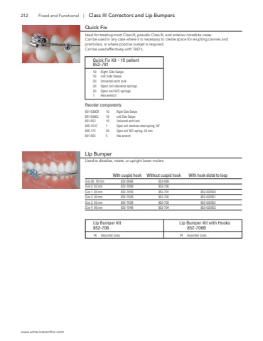 www.americanortho.com212 Fixed and Functional | Class III Correctors and Lip BumpersLip BumperUsed to distalize, rotate, or upright lower molars With cuspid hook Without cuspid hook With hook distal to loopSize 00, 78 mm 852-699B 852-699Size 0, 82 mm 852-700B 852-700Size 1, 85 mm 852-701B 852-701 852-032950Size 2, 90 mm 852-702B 852-702 852-032951Size 3, 93 mm 852-703B 852-703 852-032952Size 4, 96 mm 852-704B 852-704 852-032953Lip Bumper Kit Lip Bumper Kit with Hooks852-706 852-706B14 Assorted sizes 14 Assorted sizesQuick FixIdeal for treating most Class III, pseudo Class III, and anterior crossbite cases.Can be used in any case where it is necessary to create space for erupting canines andpremolars, or where positive overjet is required.Can be used effectively with TAD's.Quick Fix Kit - 10 patient852-78110 Right Side Swipe10 Left Side Swipe20 Universal arch lock20 Open coil stainless springs20 Open coil NiTi springs1 Hex wrenchReorder components851-638CR 10 Right Side Swipe851-638CL 10 Left Side Swipe 851-652 10 Universal arch lock 855-151C 1 Open coil stainless steel spring, 36%u201d855-172 20 Open coil NiTi spring, 20 mm851-655 5 Hex wrench