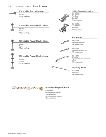 www.americanortho.com218Crimpable Stop with wire851-61610 per package Crimpable Power Hook - short855-2764 mm10 per packageCrimpable Power Hook - long855-2777 mm10 per packageCrimpable Power Hook - triple855-27810 mm10 per packageStops and Hooks | Stops & HooksUtility Traction Hooks855-030754Flat BaseBondable10 per package855-030756Curved BaseBondable10 per packageBall Hooks852-181PKWeldable, step-up100 per package852-163PKWeldable, straight flat100 per package852-182PKWeldable, short hook, long offset100 per packageAuxiliary Hook852-180PKWeldable100 per packageBondable Eruption Hook855-034843Bondable Round Base14K Gold-Filled31.75 mm Chain Length10 per package