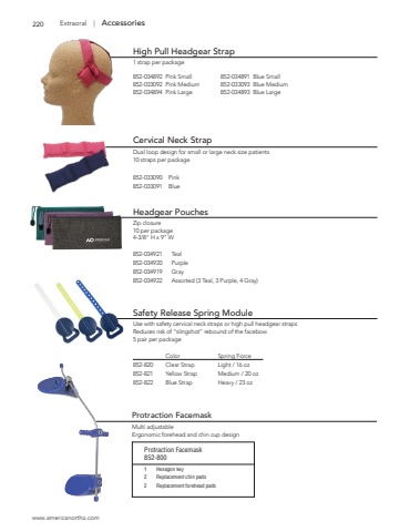 www.americanortho.com220 Extraoral | AccessoriesProtraction FacemaskMulti adjustableErgonomic forehead and chin cup designProtraction Facemask852-8001 Hexagon key2 Replacement chin pads2 Replacement forehead padsHigh Pull Headgear Strap1 strap per package852-034892 Pink Small 852-034891 Blue Small852-033092 Pink Medium 852-033093 Blue Medium852-034894 Pink Large 852-034893 Blue LargeCervical Neck StrapDual loop design for small or large neck size patients10 straps per package852-033090 Pink852-033091 BlueHeadgear PouchesZip closure10 per package4-3/8\852-034921 Teal852-034920 Purple852-034919 Gray852-034922 Assorted (3 Teal, 3 Purple, 4 Gray)Safety Release Spring ModuleUse with safety cervical neck straps or high pull headgear strapsReduces risk of %u201cslingshot%u201d rebound of the facebow5 pair per package Color Spring Force852-820 Clear Strap Light / 16 oz852-821 Yellow Strap Medium / 20 oz852-822 Blue Strap Heavy / 23 oz