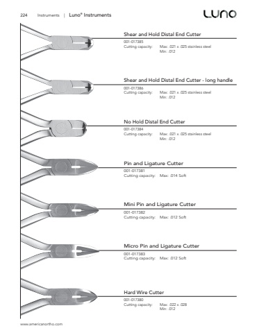 www.americanortho.com224Shear and Hold Distal End Cutter001-017385Cutting capacity: Max: .021 x .025 stainless steelMin: .012Shear and Hold Distal End Cutter - long handle001-017386Cutting capacity: Max: .021 x .025 stainless steelMin: .012No Hold Distal End Cutter001-017384Cutting capacity: Max: .021 x .025 stainless steelMin: .012Pin and Ligature Cutter001-017381Cutting capacity: Max: .014 SoftMini Pin and Ligature Cutter001-017382Cutting capacity: Max: .012 SoftMicro Pin and Ligature Cutter001-017383Cutting capacity: Max: .012 SoftHard Wire Cutter001-017380Cutting capacity: Max: .022 x .028Min: .012%u00aeInstruments | Luno%u00ae Instruments