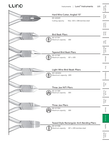 225 Self Ligating Metal Cosmetic Patient Buccal Bands & Adhesives Wire Elastomerics Mini Fixed & Stops Extraoral Instruments Supplies Practice Brackets Brackets Brackets Setups Tubes Attachments Implants Functional & Hooks MarketingHard Wire Cutter, Angled 15%u00b0001-023349Cutting capacity: Max: .022 x .028 stainless steelBird Beak Pliers001-017391Maximum capacity: .030Tapered Bird Beak Pliers001-017387Maximum capacity: .021 x .025Light Wire Bird Beak Pliers001-023353Maximum capacity: .020Three Jaw NiTi Pliers001-017389Maximum capacity: .020Three Jaw Pliers001-017394Maximum capacity: .030Tweed Style Rectangular Arch Bending Pliers001-017398Maximum capacity: .021 x .025 stainless steel%u00aeInstruments | Luno%u00ae Instruments