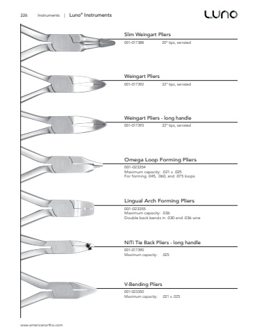 www.americanortho.com226Slim Weingart Pliers001-017388 20%u00b0 tips, serratedWeingart Pliers001-017392 32%u00b0 tips, serratedWeingart Pliers - long handle001-017393 32%u00b0 tips, serratedOmega Loop Forming Pliers001-023354Maximum capacity: .021 x .025For forming .045, .060, and .075 loopsLingual Arch Forming Pliers001-023355Maximum capacity: .036Double back bends in .030 and .036 wireNiTi Tie Back Pliers - long handle001-017390Maximum capacity: .025V-Bending Pliers001-023350Maximum capacity: .021 x .025%u00aeInstruments | Luno%u00ae Instruments