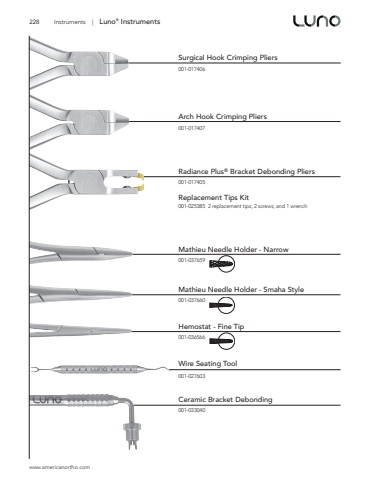 www.americanortho.com228Surgical Hook Crimping Pliers001-017406Arch Hook Crimping Pliers001-017407Radiance Plus%u00ae Bracket Debonding Pliers001-017405Replacement Tips Kit001-025385 2 replacement tips, 2 screws, and 1 wrenchMathieu Needle Holder - Narrow001-037659Mathieu Needle Holder - Smaha Style001-037660Hemostat - Fine Tip001-036566Wire Seating Tool001-027603Ceramic Bracket Debonding001-033040 %u00aeInstruments | Luno%u00ae Instruments