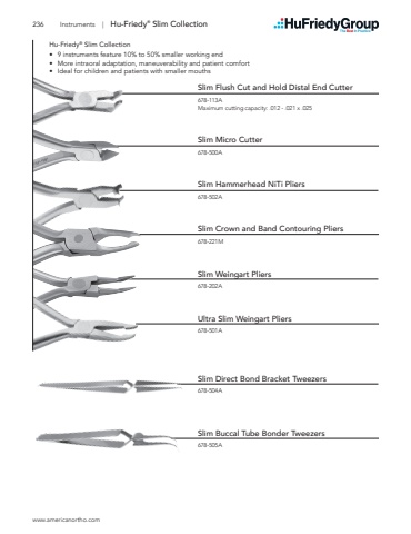 www.americanortho.com236 Instruments | Hu-Friedy%u00ae Slim CollectionSlim Flush Cut and Hold Distal End Cutter678-113AMaximum cutting capacity: .012 - .021 x .025Slim Micro Cutter678-500ASlim Hammerhead NiTi Pliers678-502ASlim Crown and Band Contouring Pliers678-221MSlim Weingart Pliers678-202AUltra Slim Weingart Pliers678-501ASlim Direct Bond Bracket Tweezers678-504ASlim Buccal Tube Bonder Tweezers678-505AHu-Friedy%u00ae Slim Collection%u2022 9 instruments feature 10% to 50% smaller working end%u2022 More intraoral adaptation, maneuverability and patient comfort%u2022 Ideal for children and patients with smaller mouths