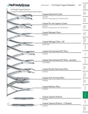 237 Self Ligating Metal Cosmetic Patient Buccal Bands & Adhesives Wire Elastomerics Mini Fixed & Stops Extraoral Instruments Supplies Practice Brackets Brackets Brackets Setups Tubes Attachments Implants Functional & Hooks MarketingInstruments | Hu-Friedy%u00ae Lingual CollectionLingual Distal End Cutter678-700AMaximum cutting capacity: .012 stainless steelLingual Pin and Ligature Cutter678-701AMaximum cutting capacity: .012 stainless steelLingual Weingart Pliers678-702A Lingual Weingart Pliers - 90%u02da678-702-90ALingual Hammerhead NiTi Pliers678-704ALingual Hammerhead NiTi Pliers - serrated678-704SERALingual Bracket Removing Pliers678-703ALingual Arch Forming Pliers678-309ALingual Mathieu Pliers678-705ALingual Ligature Director678-706ALingual Ligature Director - U Shaped678-707AHu-Friedy%u00ae Lingual Collection%u2022 Ideal for working with lingual bracket systems